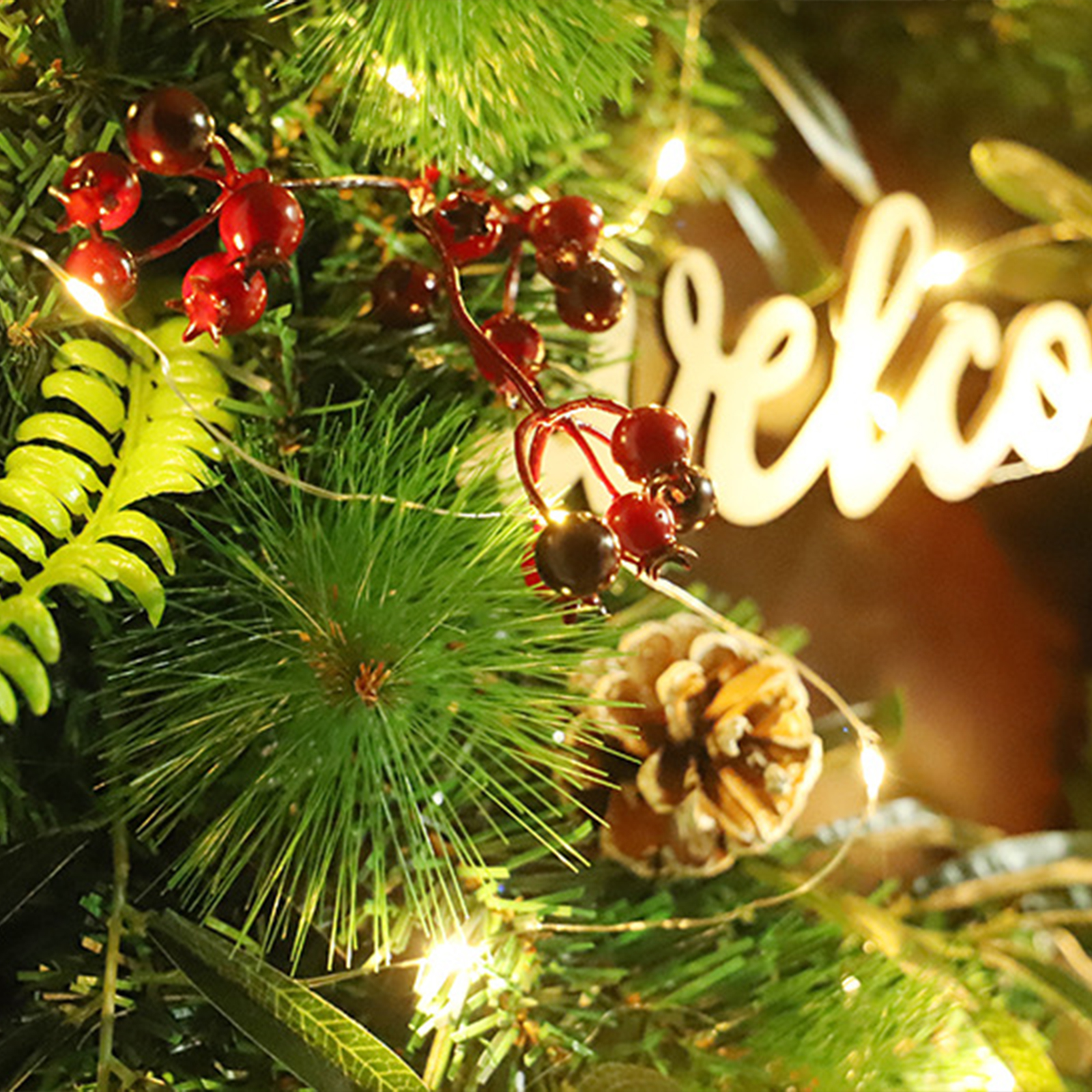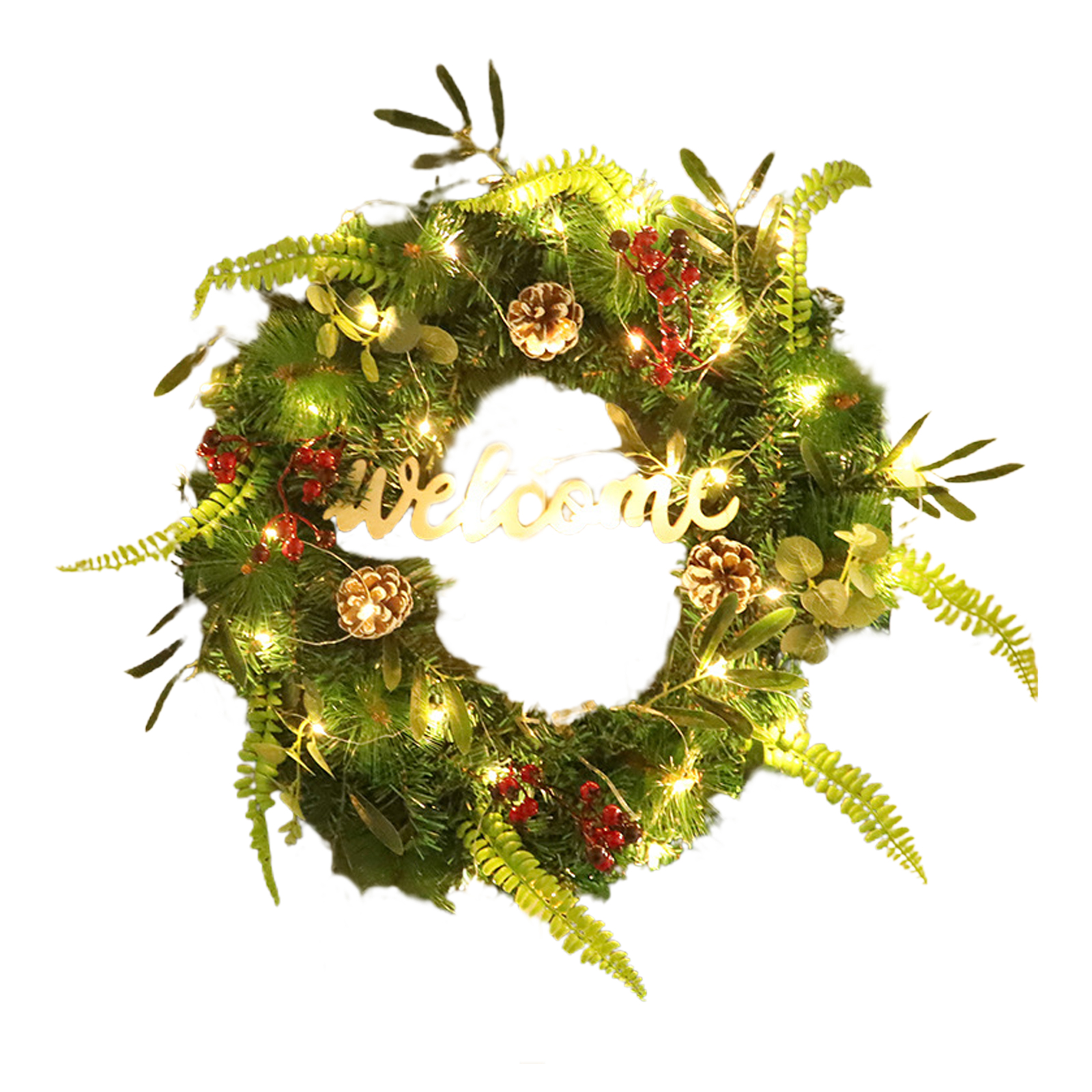 1. Уникальный дизайн: Рождественский венок изготовлен из прочной пвх основы, разработан с яркими искусственными листьями, натуральным шиповником и поролоновыми красными ягодами, реалистичный и красивый. Осветите ваш дом.