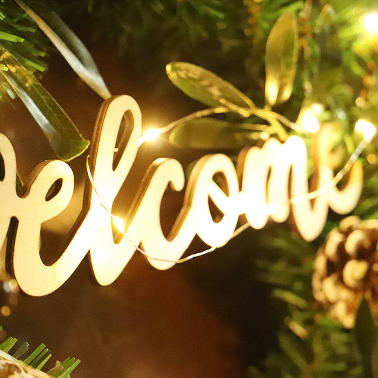 5. Светящийся венок: венок оснащен ламповой струной, длиной 2 метра, с 20 ламповыми бусинами и теплым белым светом. Для этого нужны 2 батарейки типа АА. (не входят в комплект)