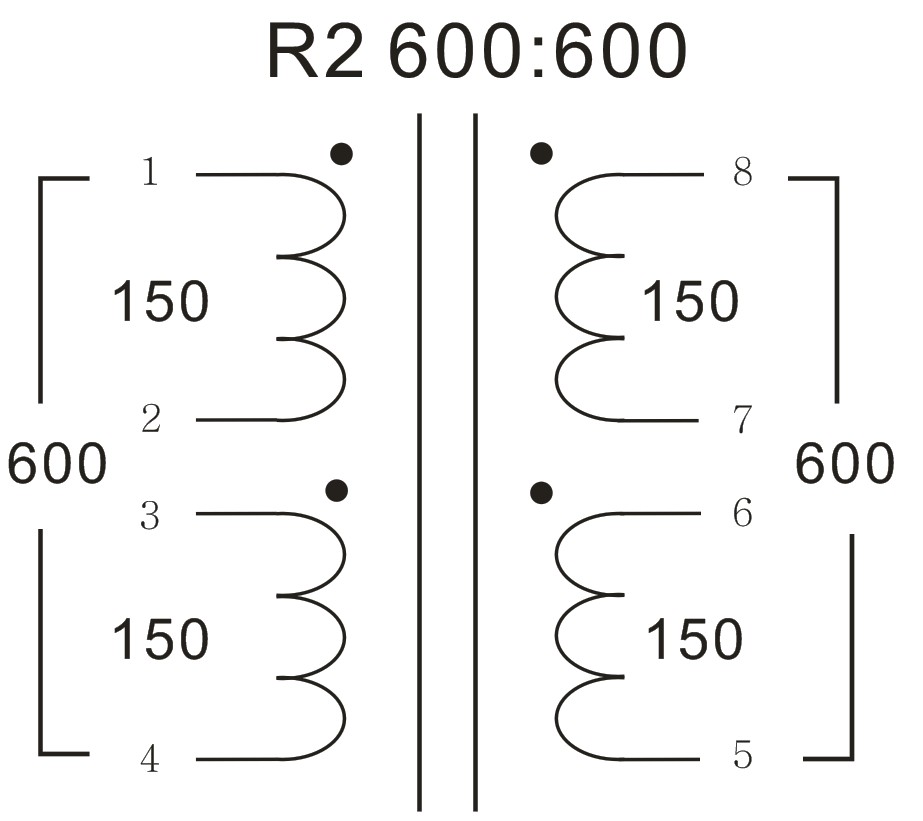 Трансформатор имеет гибкую конструкцию. Первичные и вторичные обмотки делятся на 2 обмотки 150 Ом и могут быть объединены в стандартное сопротивление 600 через соединение серии. Он может использоваться как односторонний вход, Односторонний выход, односторонний вход, сбалансированный выход, сбалансированный вход, Односторонний выход, сбалансированный вход, сбалансированный выход и т. д.