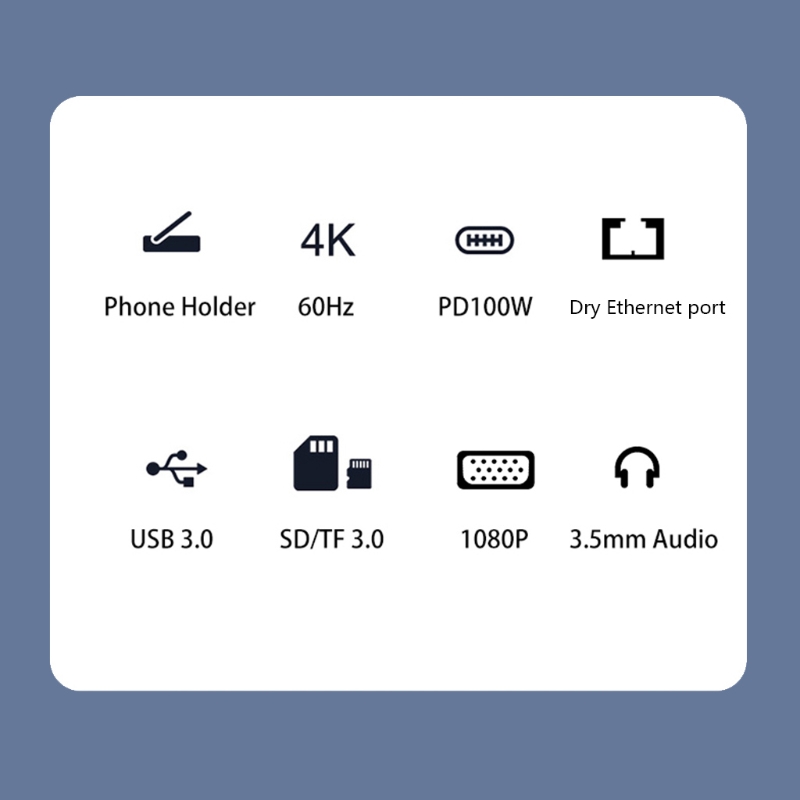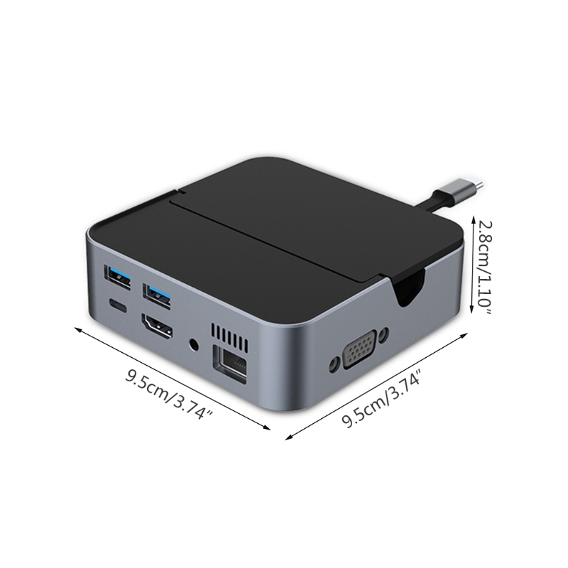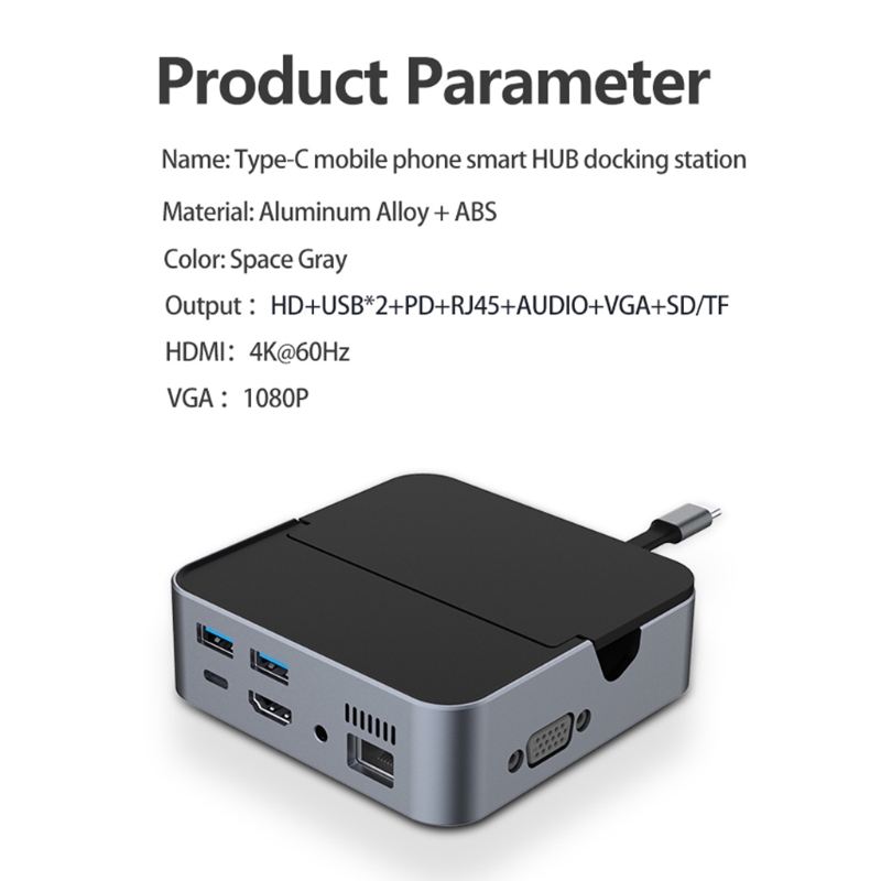Девять в одном решение для тревоги офиса, HD-MI + USBx2 + PD + RJ45 + аудио + VGA + SD/TF, док-станция + кронштейн + зарядное устройство, бесшовная интеграция.