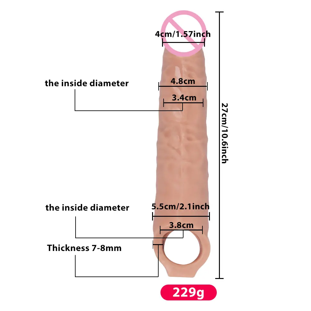Подходящая длина пениса 120-150 мм и диаметр 25-40 мм. Благодаря полой конструкции около 140 мм внутри продукта, презерватив может быть согнут, когда пенис меньше по размеру. При использовании удлинителя полового члена рекомендуется нанести небольшое количество смазки на поверхность пениса, чтобы пенис мог быть вставлен гладко.