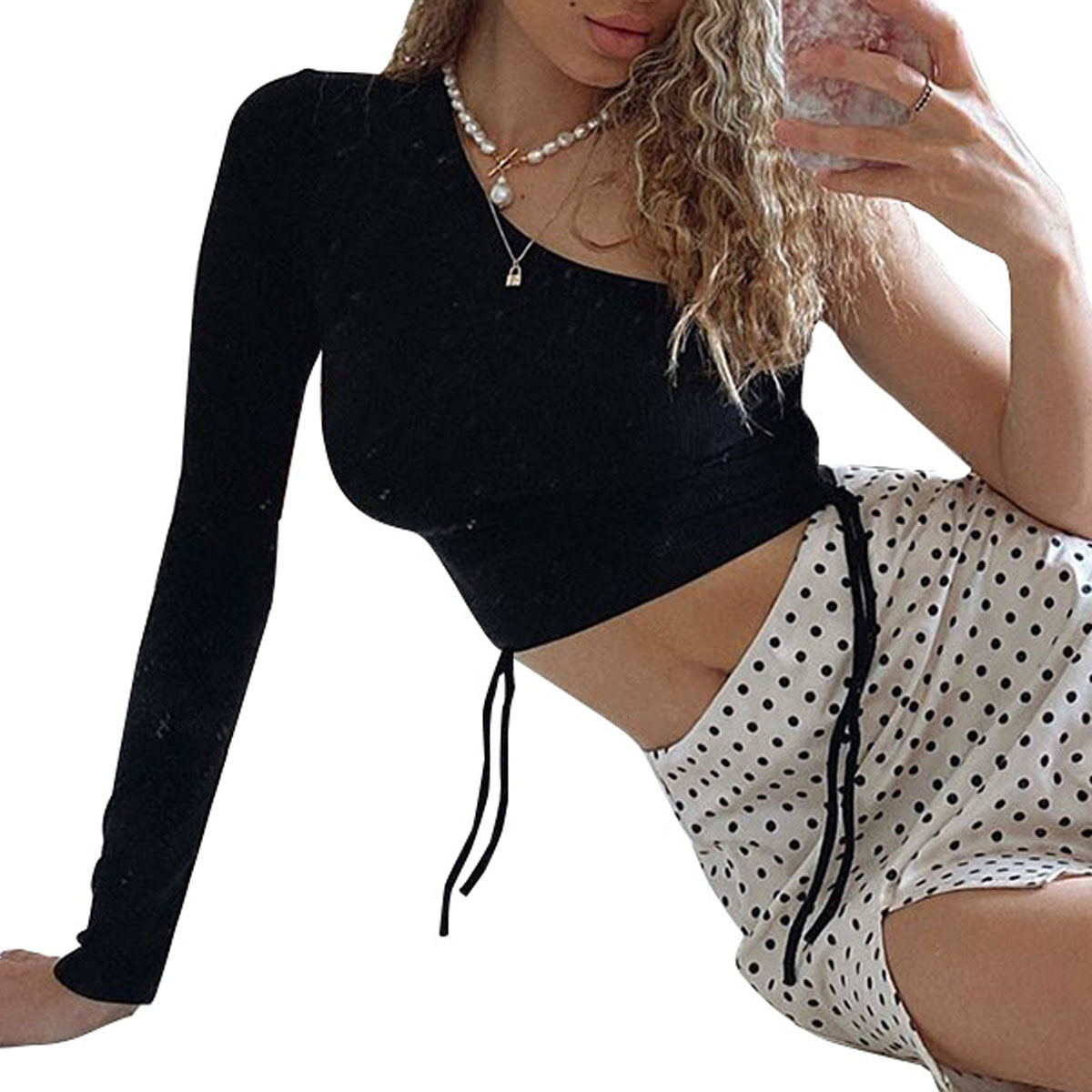 Женская сексуальная Однотонная футболка с длинными рукавами, плиссированный Тонкий Топ с открытыми плечами и завязками, повседневная одежда