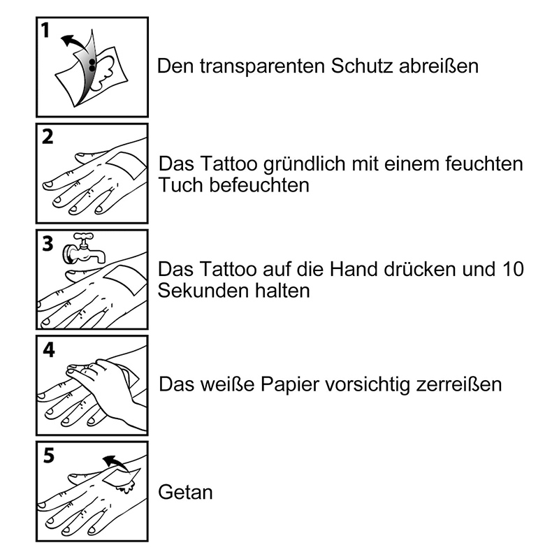 Простота в использовании: Оторвите прозрачную защиту, тщательно смочите татуировку влажной тканью, нажмите на татуировку на руке и удерживайте в течение 10 секунд, осторожно разорвите белую бумагу, и вы закончите.