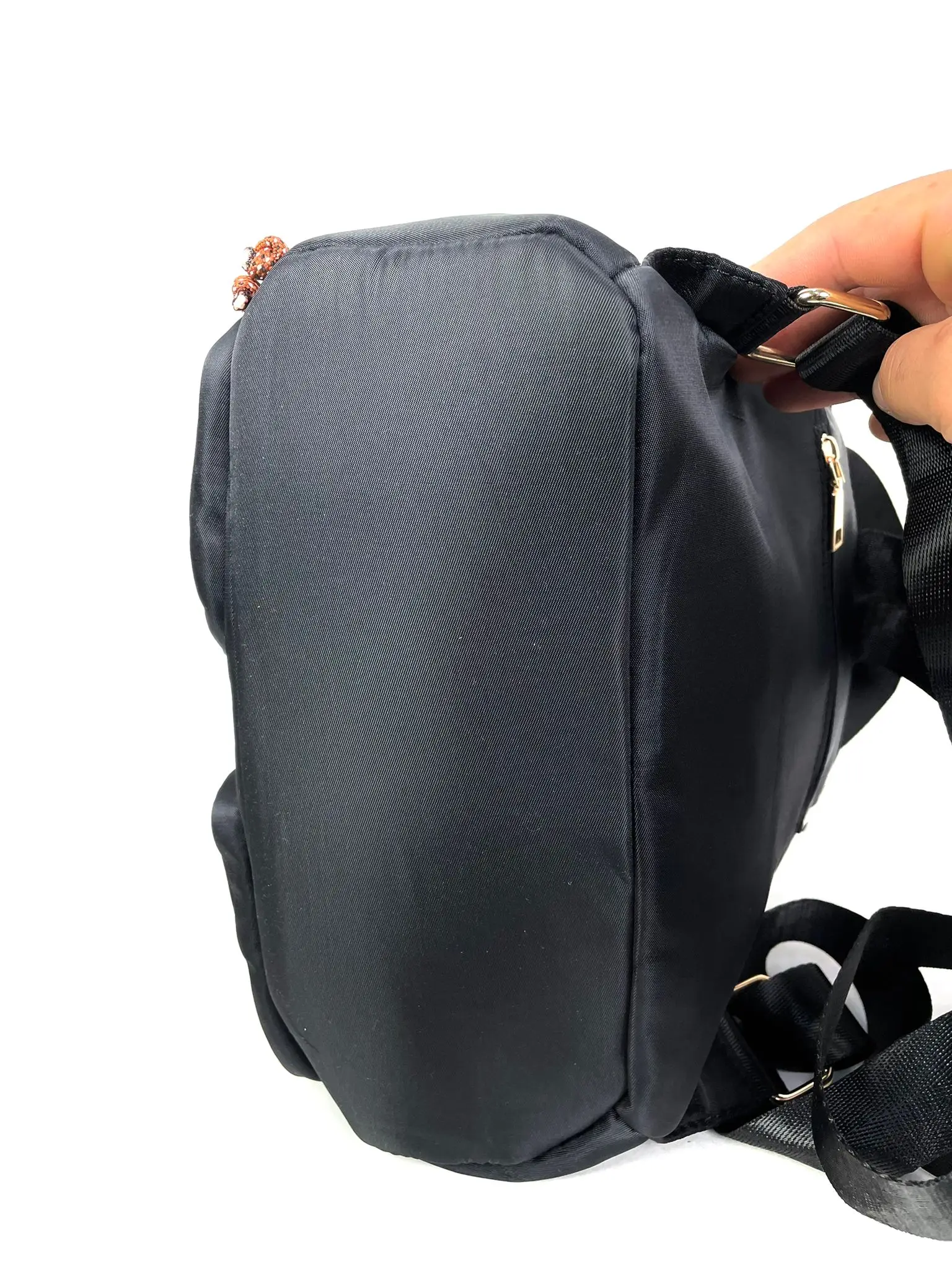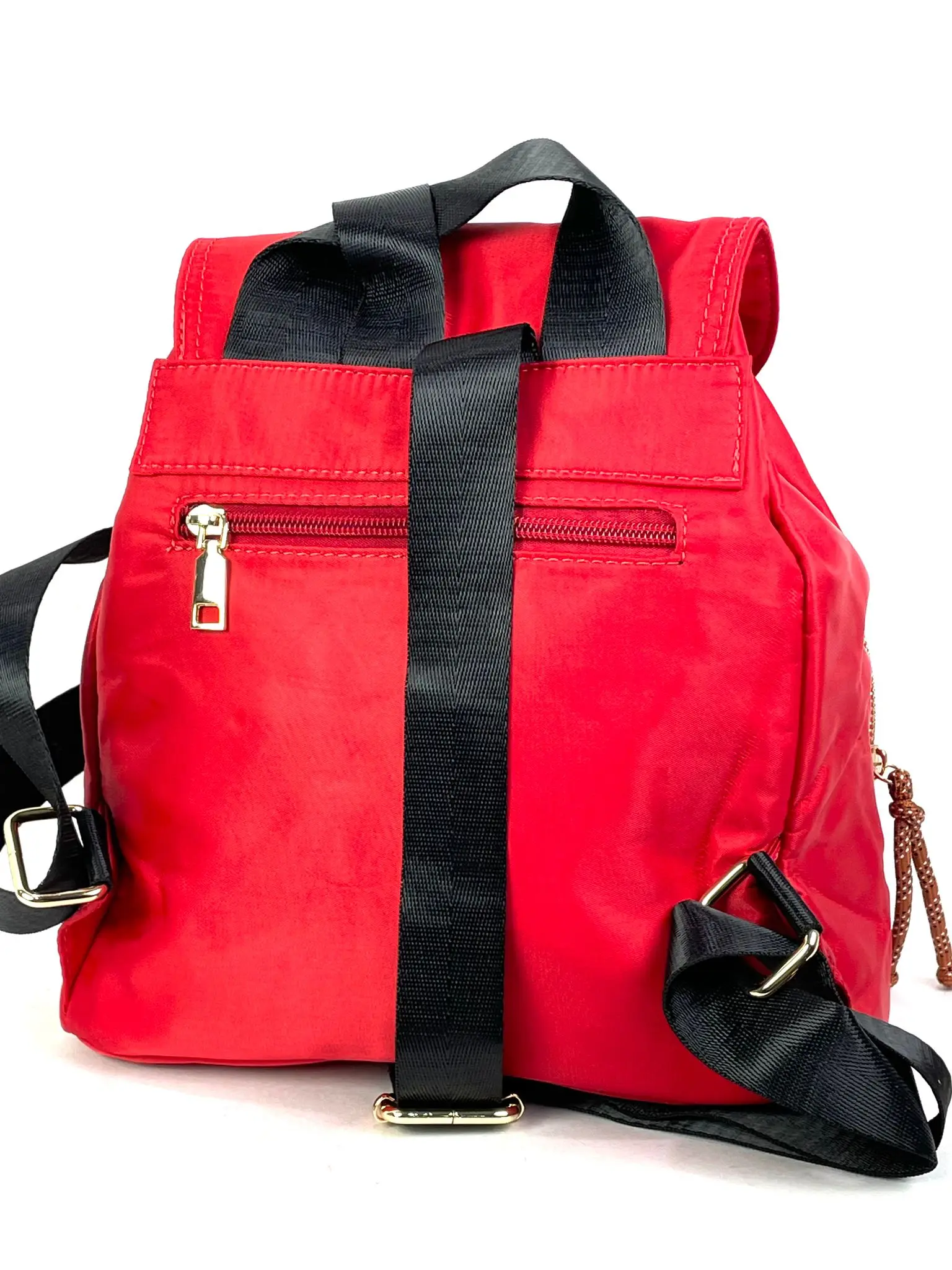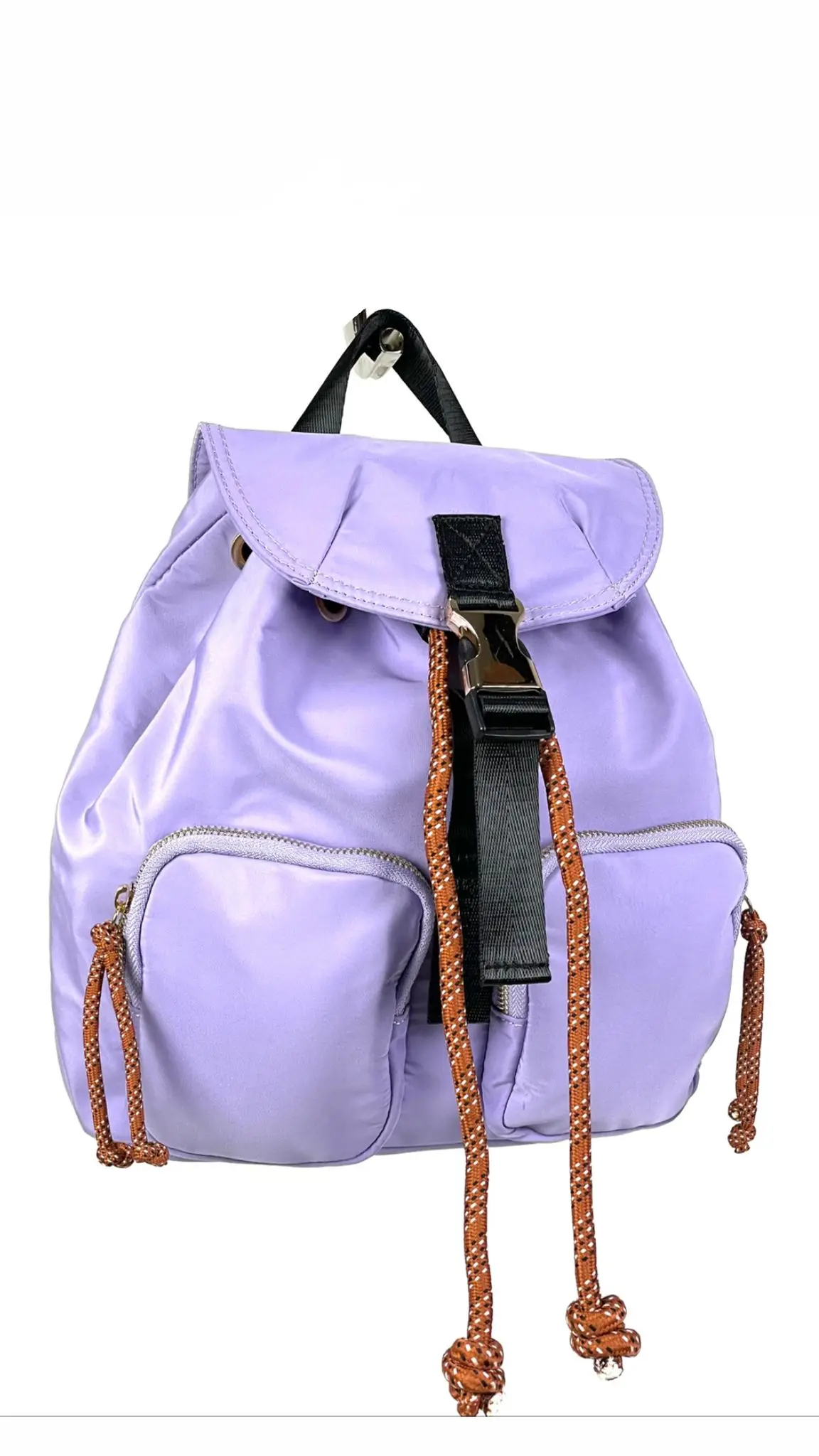 Дизайн включает однотонный принт и три внешних кармана спереди и сзади, все с застежкой-молнией. Основная застежка-шнур. В комплект входит короткая ручка для переноски в руке и две длинные ручки для переноски на спине. Внутренняя часть рюкзака отделана полиэстером и включает внутренний карман с застежкой-молнией и два кармана на мобильный телефон и ключи. Дизайн также включает клапан с металлической застежкой и декоративные шнурки на молниях боковых карманов.