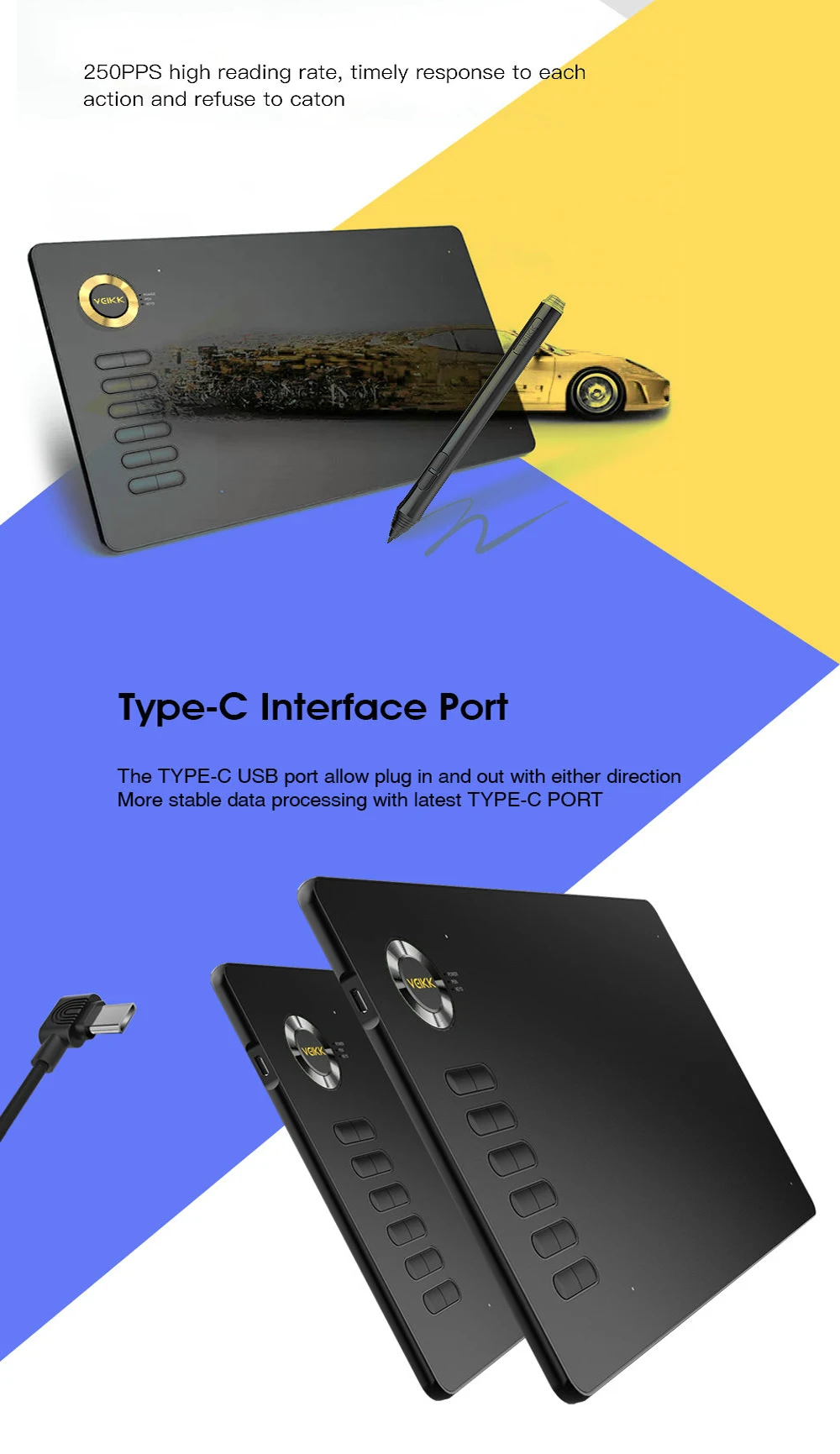 Large Working Area & Type-C Input Design : VEIKK A15 animation tablet features 10 x 6 inch large active area with papery texture surface, and it is thin (only 9mm) and light enough so you can carry it around your workspace. The TYPE- C USB port allow plug in and out with either direction, which is more convenient and stable. VEIKK provides 1 year warranty and lifetime technical support for all VEIKK drawing tablets/display.