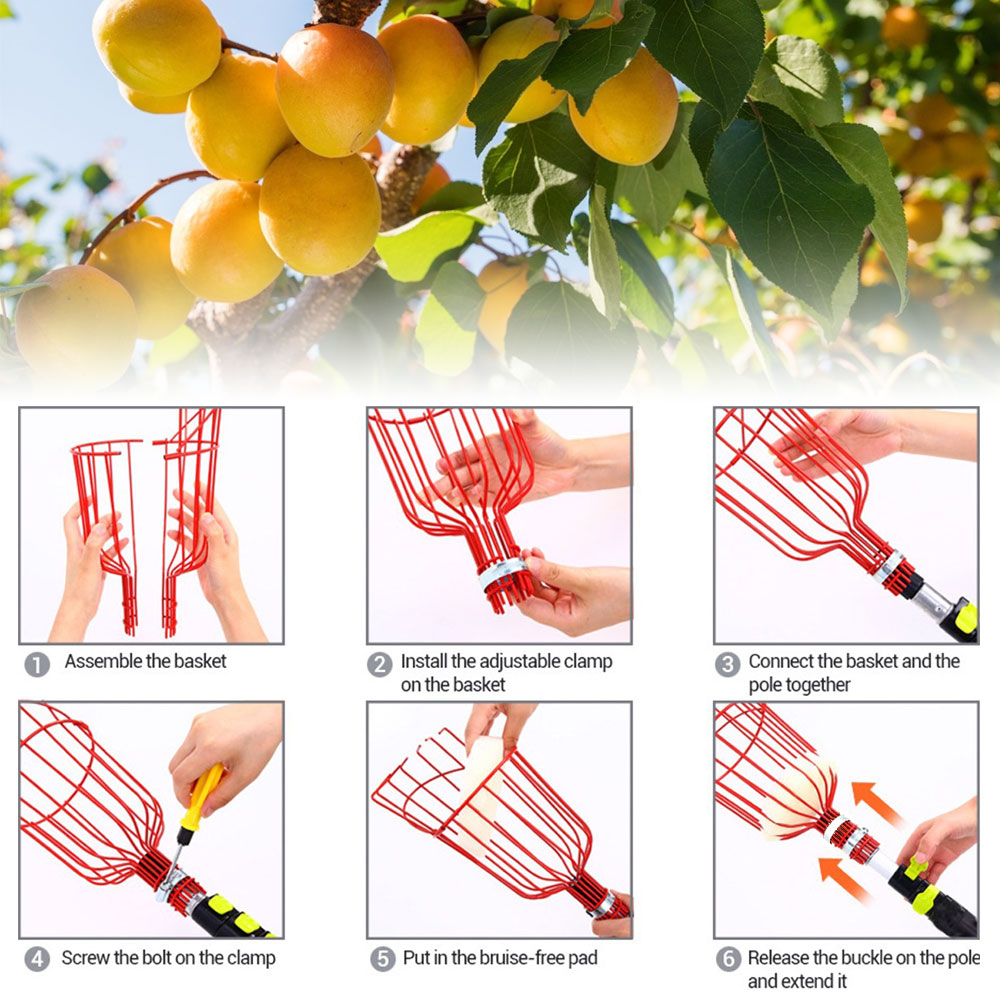 【Easy Twist-on Installation】First assemble the fruit picker basket, install the adjustable clamp on basket, twist the basket on the pole (not included), screw the bolt on the clamp, then put the sponge pad in the basket.