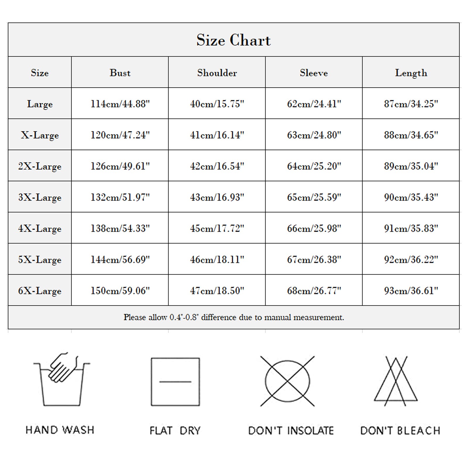 XXXXXL | 144 см/56,69'' | 46 см/18,11'' | 67 см/26,38'' | 92 см/36,22'' |