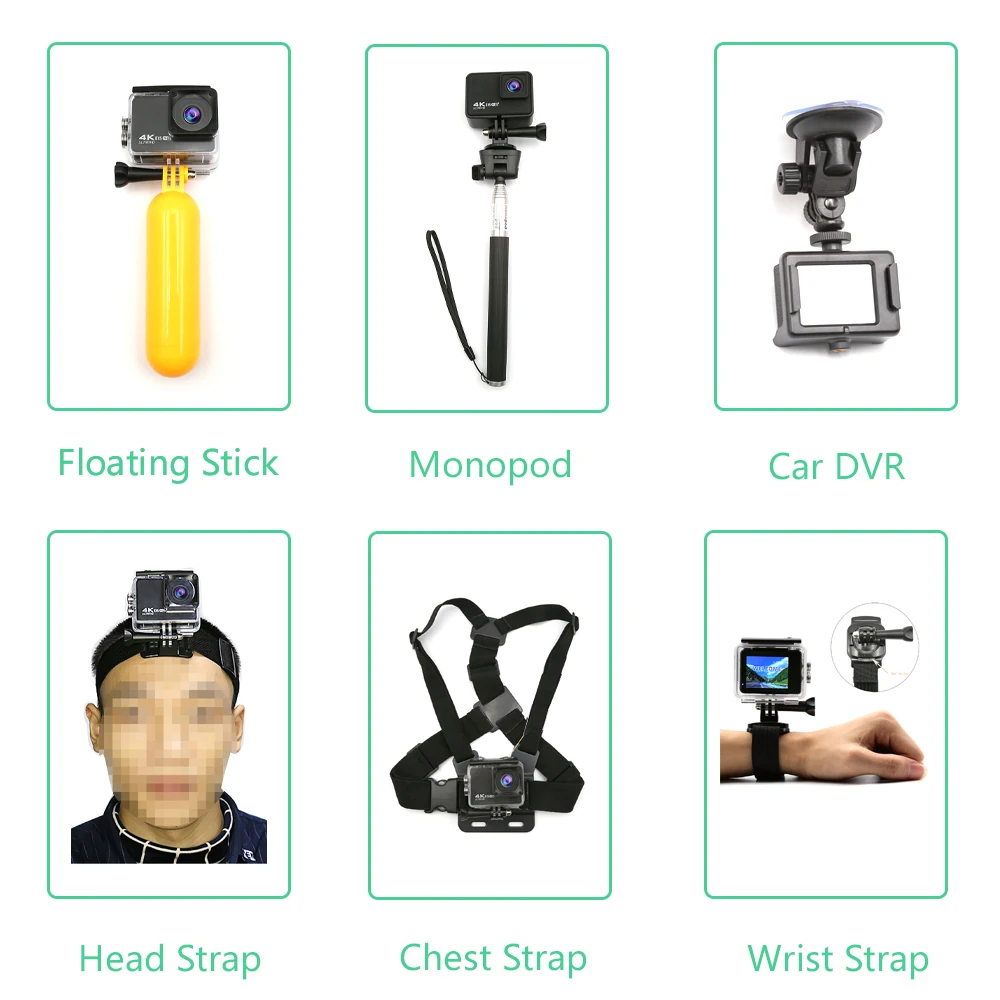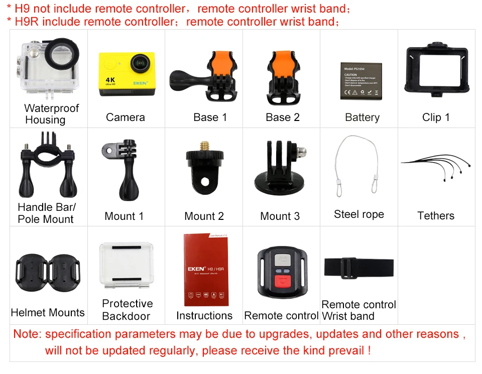 Этот товар имеет 4 цвета: черный, белый, серебристый и желтый. Мы отправляем черный цвет по умолчанию. Если вам нужны другие цвета, пожалуйста, обратите внимание на другие цвета, которые вам нужны в заказе. Подарки отправляются бесплатно, и мы не принимаем Никаких споров из-за подарков и цветов.<;br/> Стандарт: H9 камера + аксессуары (оригинальная коробка)<;br/> Стандарт: H9R камера + пульт + аксессуары (оригинальная коробка)<;br/> Вариант A: стандартный H9R (оригинальная коробка) + двойное зарядное устройство + батарея <;br/> Вариант B: Стандартный H9R + двойное зарядное устройство + аккумулятор + Коллекционная сумка (без оригинальной коробки)<;br/> вариант C: StandardH9R (оригинальная коробка) + двойное зарядное устройство + аккумулятор + монопод + плавающая палка + Tirpod +<;br/>+ присоска держатель <;br/> вариант D : StandardH9R (оригинальная коробка) + двойное зарядное устройство + аккумулятор + ремешок на голову + ремешок на запястье + нагрудный ремень <;br/> вариант E: Стандарт dh9r + двойное зарядное устройство + аккумулятор + монопод + плавающая палка + Tirpod + присоска держатель + Коллекционная сумка (без оригинальной коробки)<;br/> вариант F: стандарт dh9r + двойное зарядное устройство + аккумулятор + ремешок на голову + ремешок на запястье + нагрудный ремень + сумка для коллекции (без оригинальной коробки)<;br/> вариант G: стандарт dh9r (оригинальная коробка) + Двойное зарядное устройство + аккумулятор + монопод + ремешок на голову + ремешок на запястье + держатель на присоске + нагрудный ремень + плавающая палочка + наконечник <;br/> вариант H: standardH9R + двойное зарядное устройство + аккумулятор + монопод + ремешок на голову + ремешок на запястье + держатель на присоске + нагрудный ремень + плавающая палочка + стилус + сумка для сбора (без оригинальной коробки)<;br/> Примечание:<;br/>* 2,0 дюймов ЖК-дисплей экран <;br/> водостойкий корпус, который позволяет снимать увлекательные водные виды спорта; Водонепроницаемость на глубине до 30 метров под водой.<;br/>* 20-мегапиксельный Широкоугольный объектив HD 170.<;br/>* диапазон управления Wi-Fi составляет 3 м. Поддержка приложений ed, Android /ISO <;br/>* Поддержка карт памяти до 32 ГБ максимум <;br/>* несколько форматов видеозаписи: 4K/2,7 K/1080p/720P<;br/>* 4K только 30 кадров в секунду, только 2,7 K 30FPS. Но большинство ПК принимает только видео 1080P. Таким образом, мы предлагаем запись 1080P 60FPS, это лучший и наиболее свободно.<;br/>* эта камера может использовать только карту памяти хорошего уровня 10 или более быструю карту U3. Мы не принимаем Никаких споров, вызванных использованием других карт памяти (не купленных нашим магазином) во время использования камеры.