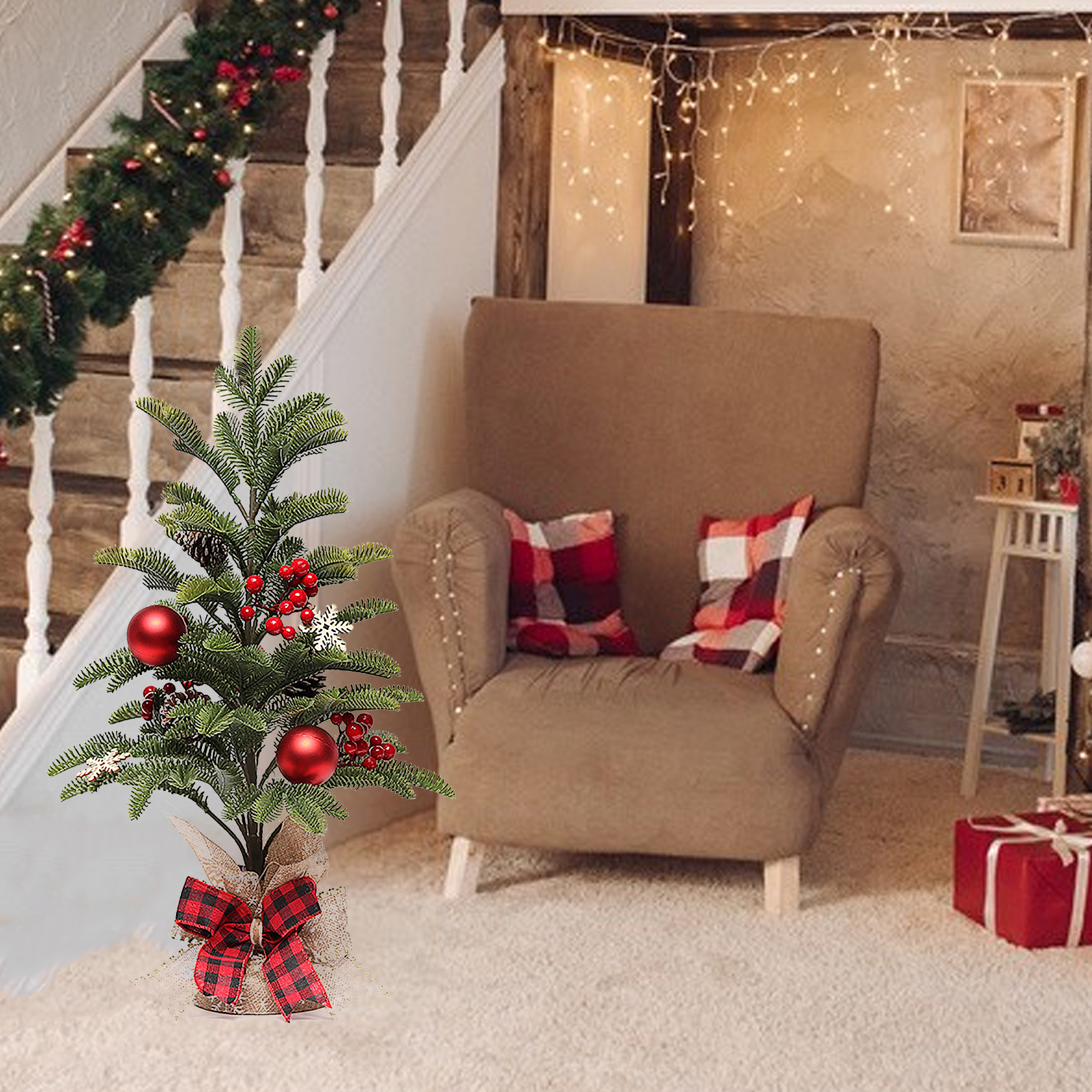 1. Хорошее качество: Мини Рождественская елка изготовлена из PE сосновых иголок, елочные шары из пены и красных ягод, натуральные пинетки и нежный лук, прочный и прочный, реалистичный внешний вид и без запаха.