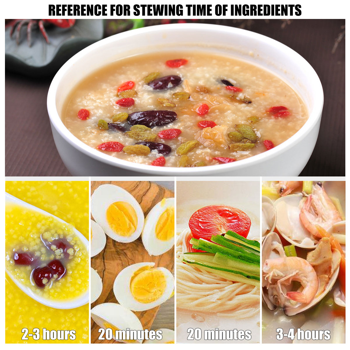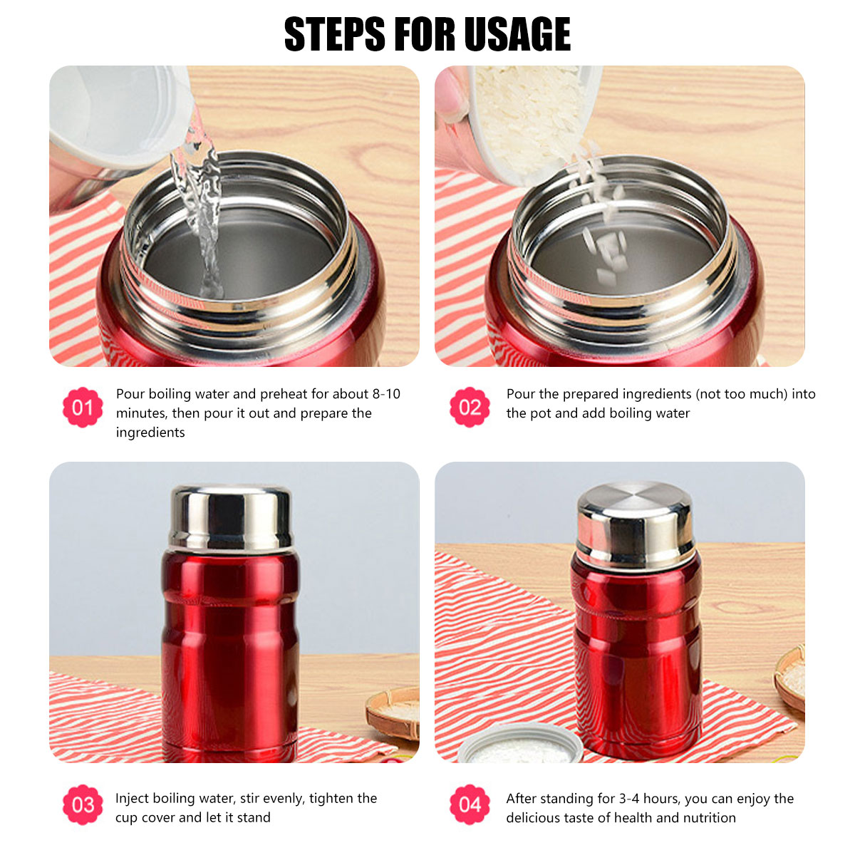 [Вареные деликатесы] пищевые банки можно использовать для тушеных яиц (2-4 часа), лапши (20-30 минут), каши (3-6 часов). Примечание: Перед использованием пищевой фляги для тушения, пожалуйста, залейте кипящую воду в флягу, подогрейте флягу в течение 3-5 минут, затем залейте ингредиенты и кипятку, И затяните крышку.