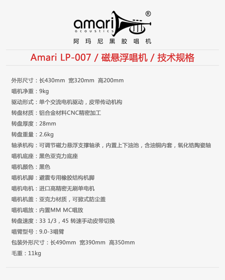 Amari LP-007/Phono магнитной левитации/технические характеристики