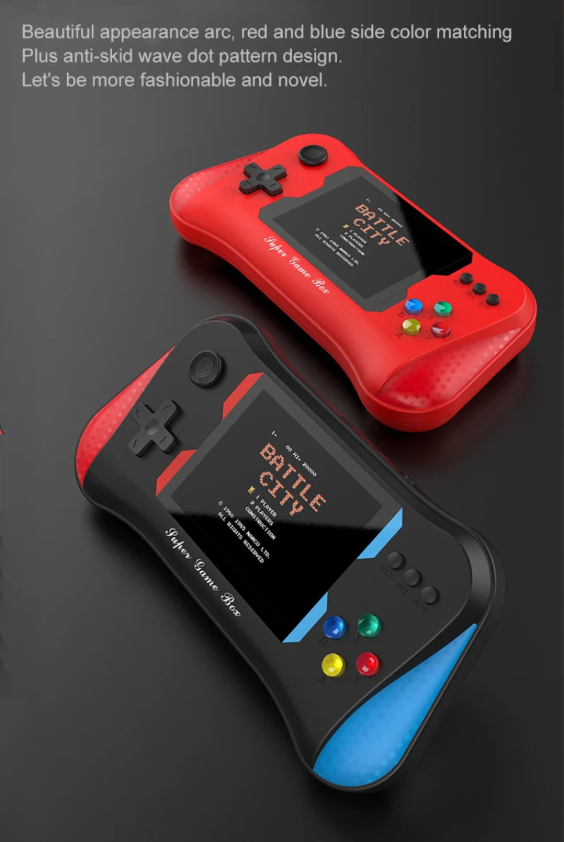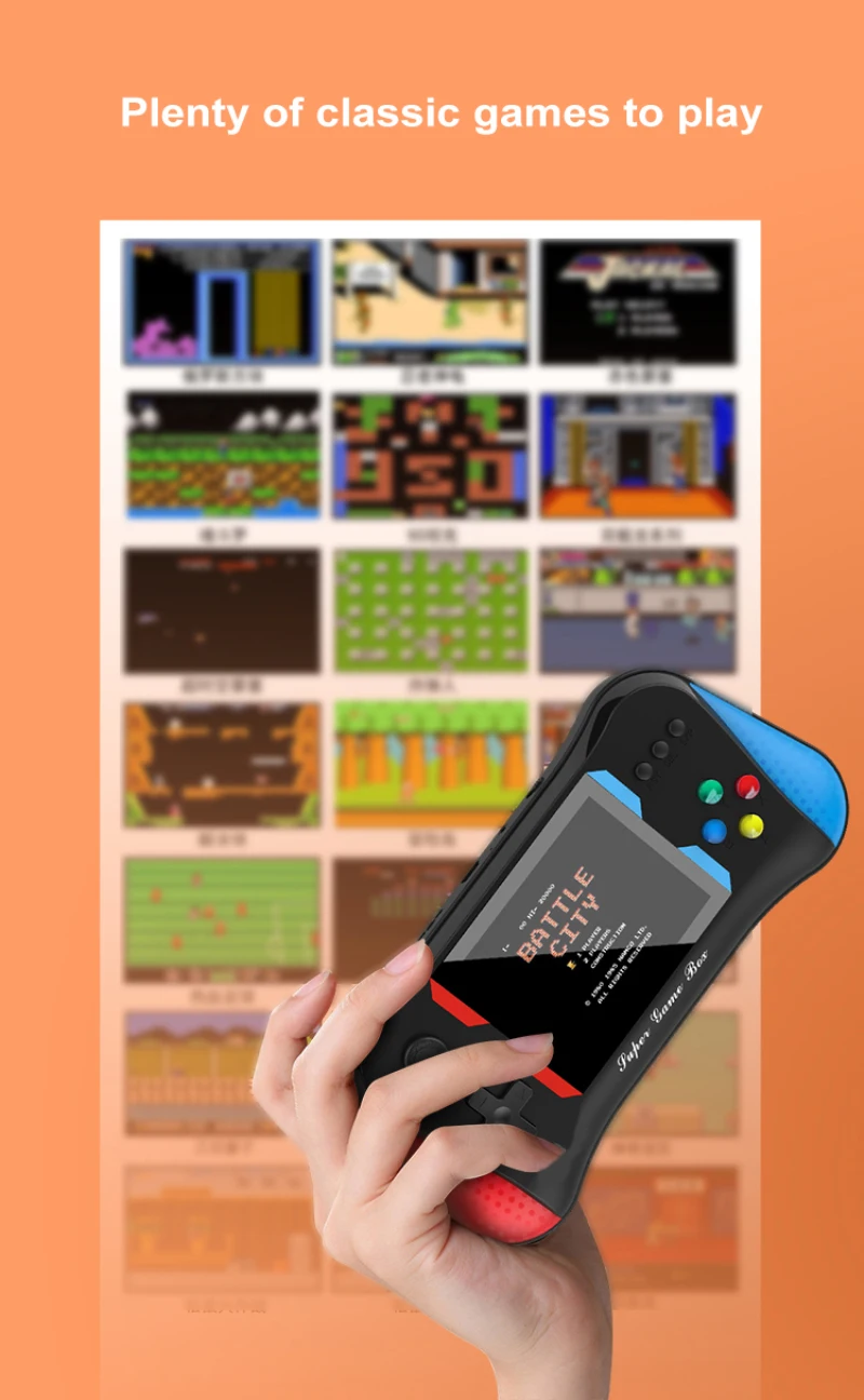 • Портативный и легко носить с собой. Небольшая и легкая портативная игровая консоль, мини-корпус, можно носить с собой. На пути к работе, свободное время-лучший вариант для отдыха. Играйте в любое время, в любом месте, наслаждайтесь детским отдыхом на поезде, самолете, кемпинге или путешествиях.