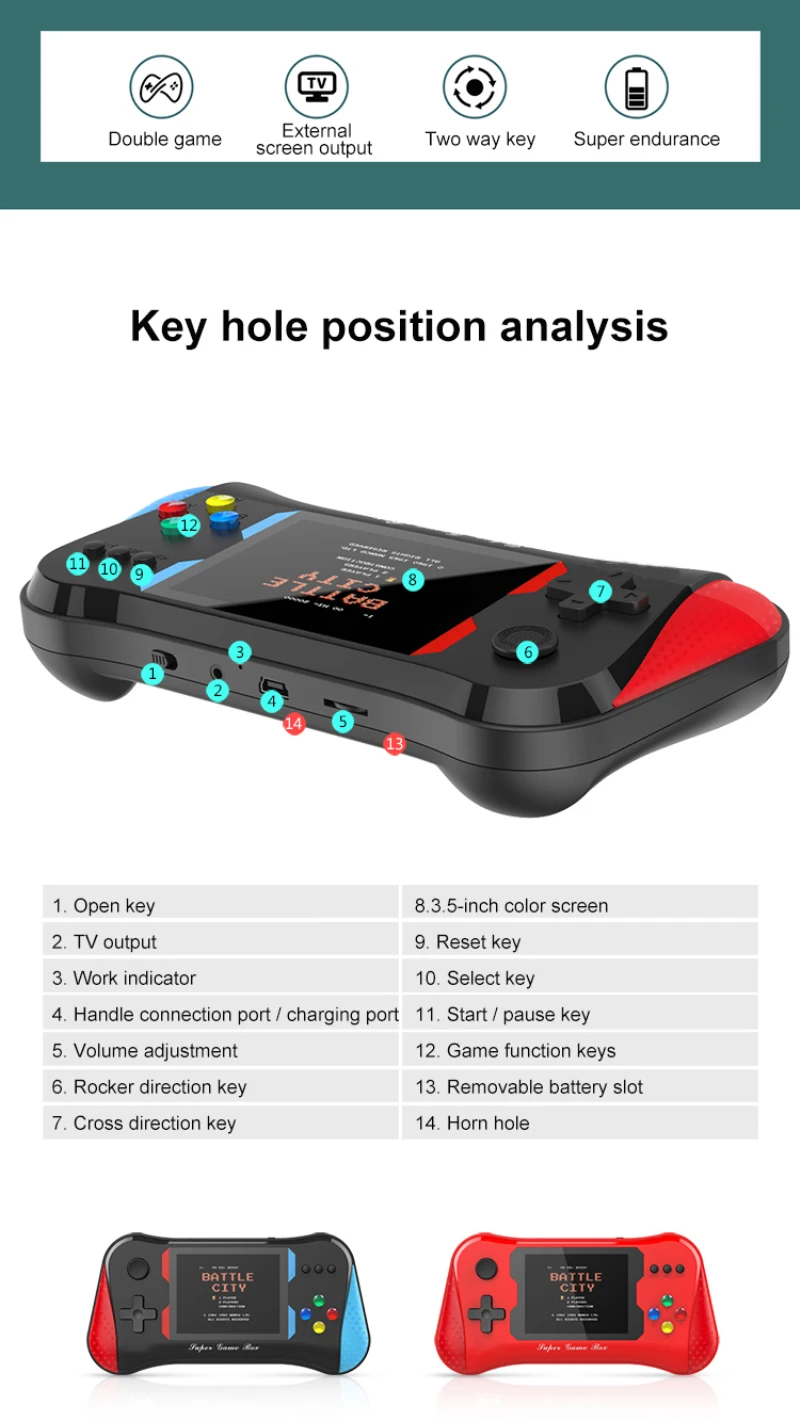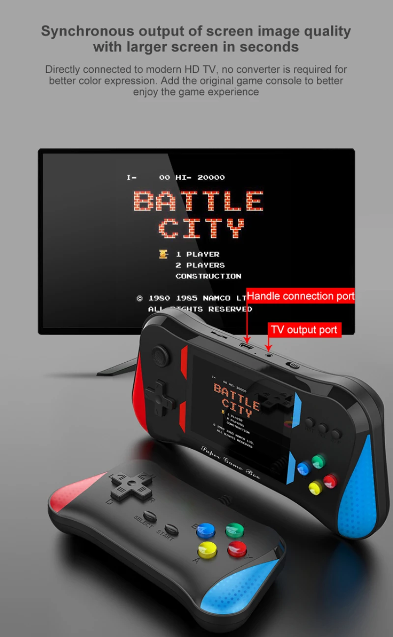 • 500 классических игр. Игровая приставка содержит 500 популярных игр: ретро-аркадные игры, футбол, спорт, головоломка, стрельба, гонки, боевые игры, приключения и т. Д. Подарите воспоминания о детском веселье и наслаждайтесь семейными развлечениями.