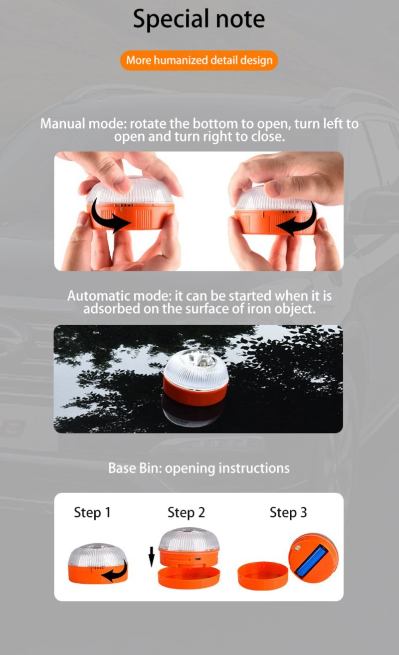 【Водонепроницаемость IP65 】 корпус автомобиля аварийный светильник изготовлен из прочных материалов. Аварийный светильник предназначен для защиты от дождя, влажности и снега. Это незаменимый инструмент для транспортного средства, велосипеда или любой чрезвычайной ситуации.