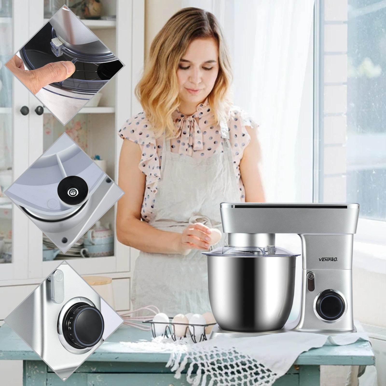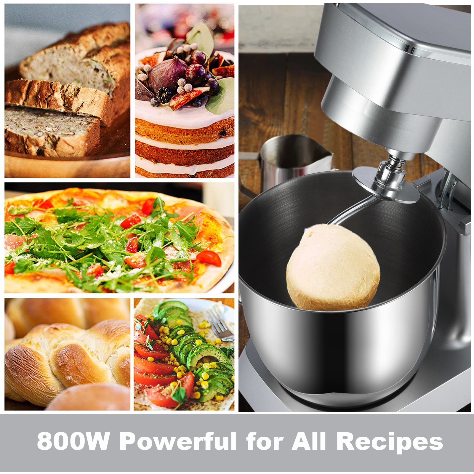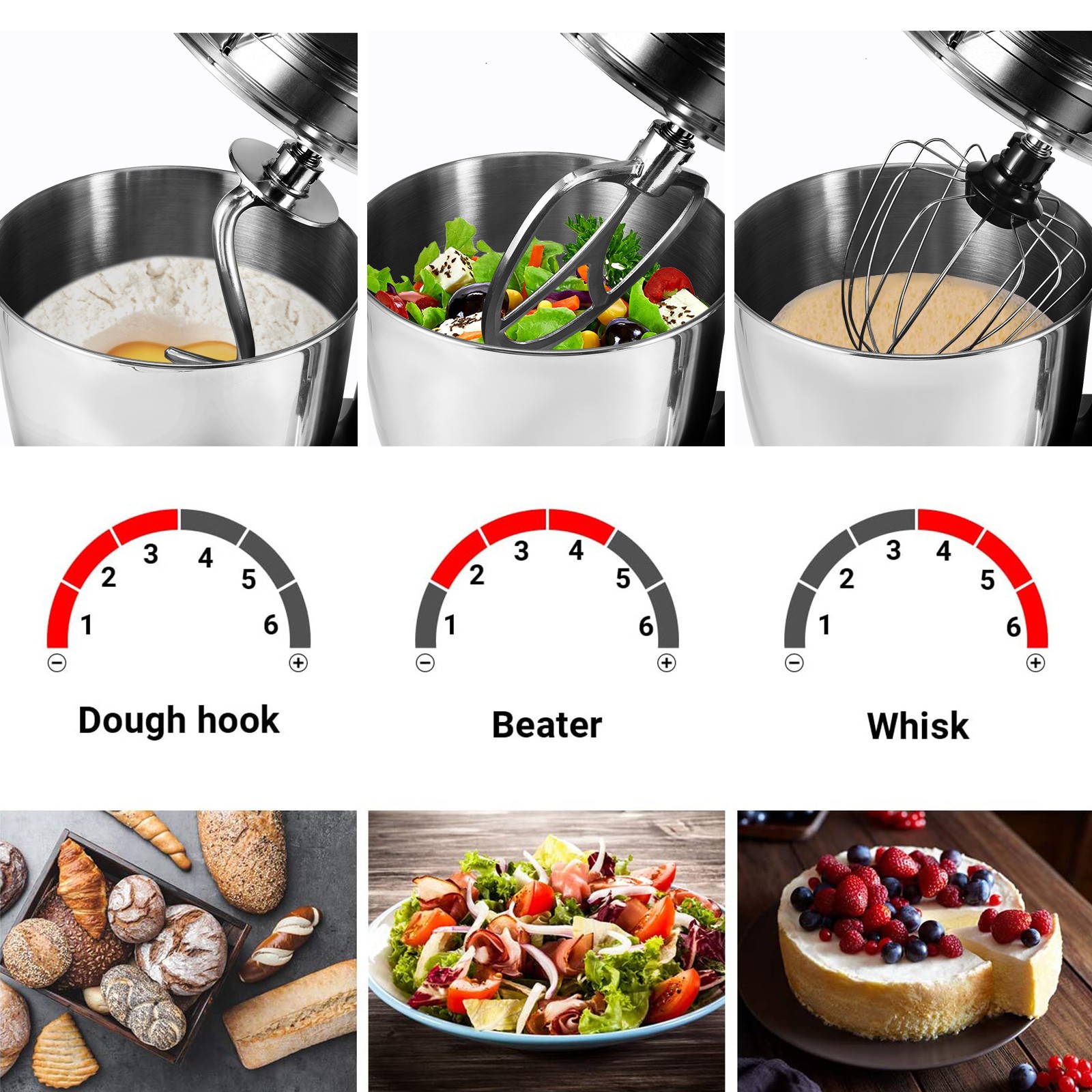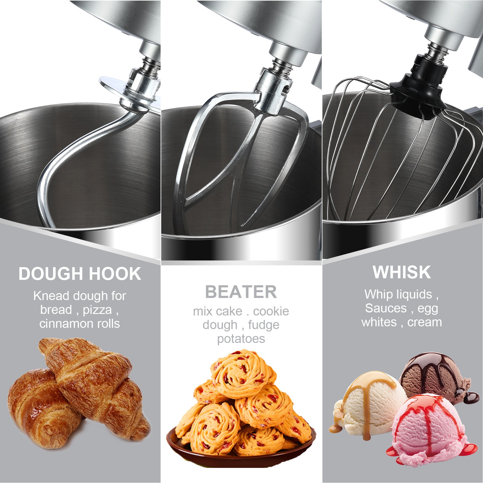 【MULTIPLE ATTACHMENT SET】Stand mixer comes with 6 different attachments: whisk, dough hook, flat beater, eg/g white separator and a scraper. The splash guard with access H/atch helps add ingredients. You can use it to make most things in your home-small batches of muffins or cookies, cakes, icing, bread, mashed potatoes etc.