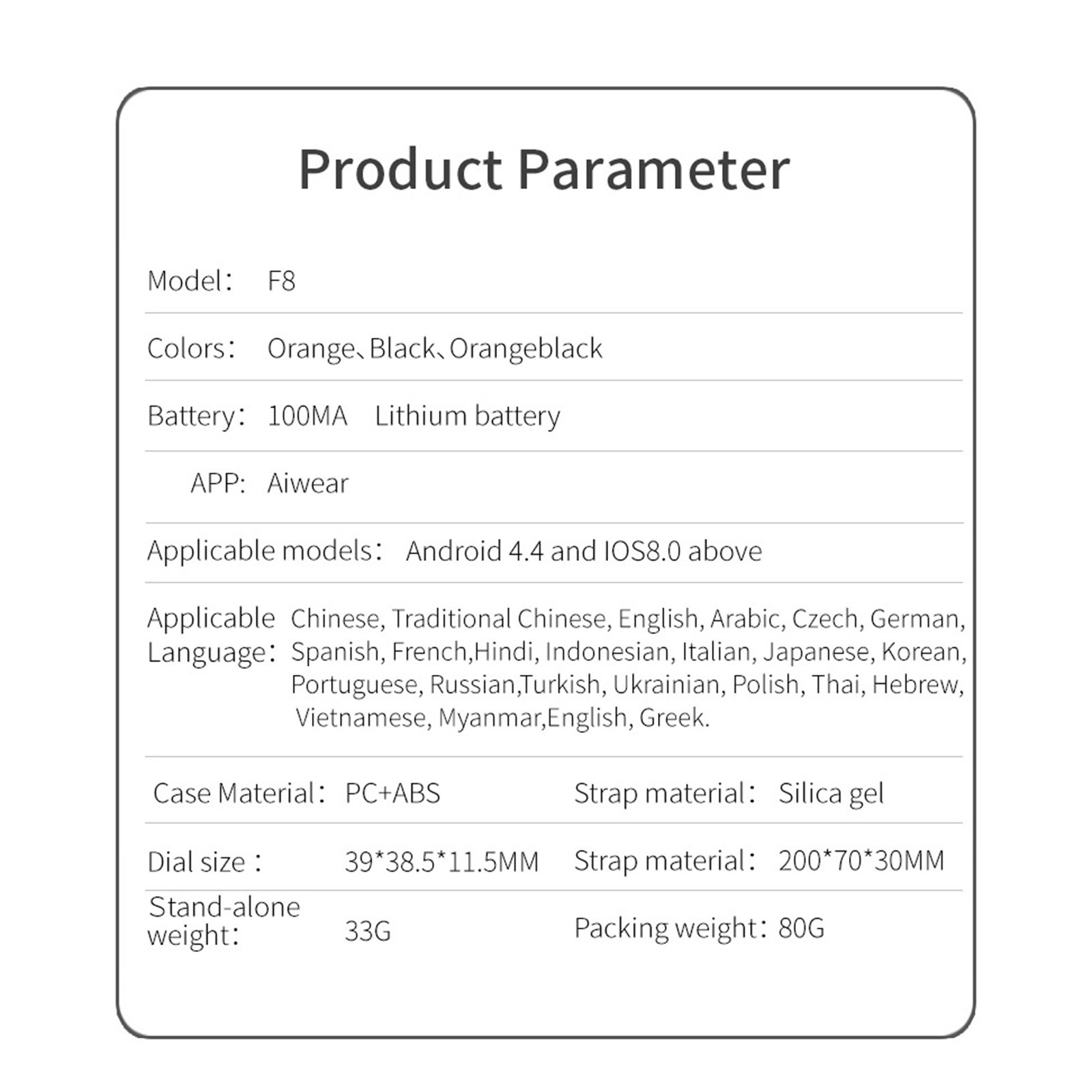 1. С использованием полноцветного дисплея 0,96 дюйма PS HD, превосходного качества изображения HD. Часто используемые приложения быстро и делают ваш опыт более удобным. 2. Встроенный оптический датчик сердечного ритма, в сочетании с интеллектуальным алгоритмом сердечного ритма, чтобы следить за изменением частоты сердечных сокращений в течение всего дня, независимо от того, находится ли он в состоянии покоя или упражнений, можно точно контролировать частоту сердечных сокращений. 3. Сообщение, входящий вызов, отторжение часов, функция отключения звука, напоминание о сидячем положении, уведомление о сообщениях в приложении, все доступно, умное напоминание о вибрации, чтобы избежать недостающей важной информации 4. Удовлетворить ваши ежедневные потребности, так что вы можете в открытом воздухе деятельности, мыть руки или носить его в дождь, и чувствовать себя более легко. Вы можете играть все, что захотите. 5. Предустановленные основные виды спорта, такие как прогулки, бег, альпинизм и Велоспорт, всегда готовятся к занятиям спортом, профессиональному спортивному анализу данных, дайте вам знать больше об упражнениях. Параметры: Модель: F8 Подходящая платформа: Полностью совместима Подходящая толпа: бизнес, массовый, модный, взрослый Размер экрана: 1,28 дюйма Интерфейс: USB 2,0 Камера: нет Память фюзеляжа: 128 Мб Материал экрана: IPS Способ ношения: Браслет Совместимая система: Полностью совместима Функция связи: не поддерживается Язык меню: многоязычный Дополнительные функции: видеоразвлечения, пошаговый подсчет, мобильное позиционирование, мониторинг, социальные развлечения, интеллектуальное напоминание, удаленный автотаймер, мониторинг здоровья, информационное нажатие, отслеживание движения, анализ сна Беспроводное расстояние: 10 м Емкость аккумулятора: 200 мАч Режим работы: тип кнопки Внутреннее включение: 1 шт часыЛиния зарядки 1 шт.