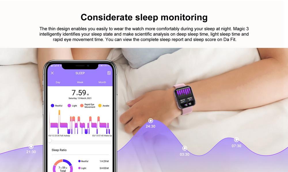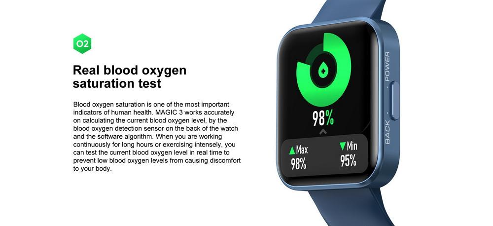 1: насыщение кислородом в крови является одним из самых важных показателей здоровья человека. MAGIC 3 работает точно над вычислением уровня кислорода в крови по датчику обнаружения кислорода в крови на задней части часов и алгоритму программного обеспечения. Когда вы работаете непрерывно в течение долгих часов или интенсивно тренируетесь, вы можете проверить текущий уровень кислорода в крови в реальном времени, чтобы предотвратить низкий уровень кислорода в крови от причинения дискомфорта вашему организму.