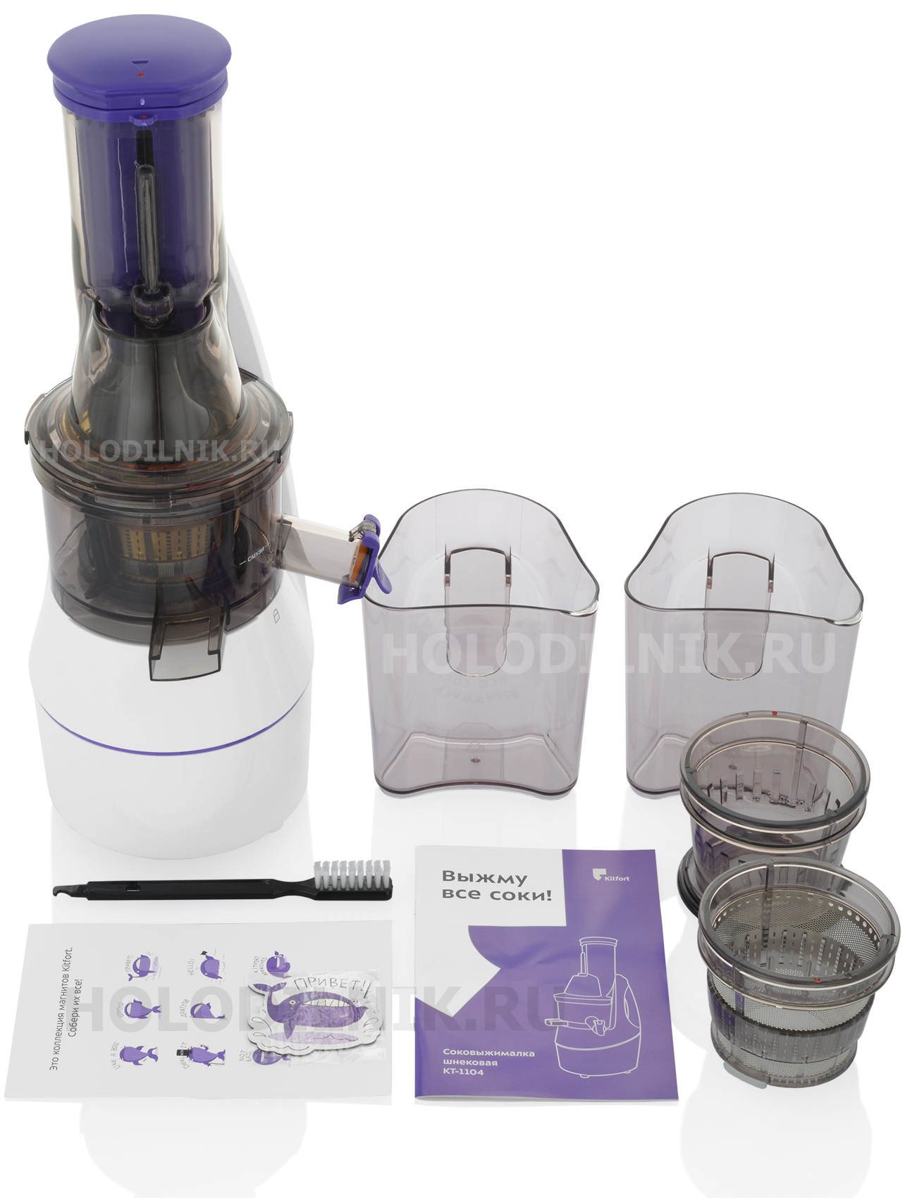 Соковыжималка Kitfort KT-1104 дополнительно комплектуется фильтром для смузи и насадкой для замороженных продуктов. Фильтр для смузи оснащен крупноячеистой сеткой и предназначен для получения соков с мякотью или пюре. Применение: мягкие и нежные спелые фрукты, овощи или ягоды - бананы, киви, помидоры, клубника, переспевшие яблоки и т.д. Насадка для замороженных продуктов позволяет приготовить фруктовое или ягодное мороженое, протереть или размять фрукты или ягоды. Эта насадка имеет выход для жмыха, но не имеет сетчатого фильтра. Продукты перетираются и измельчаются между шнеком и ребрами на внутренней стороне насадки, а затем выходят через жмыховый канал.