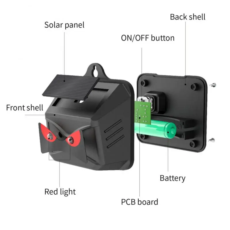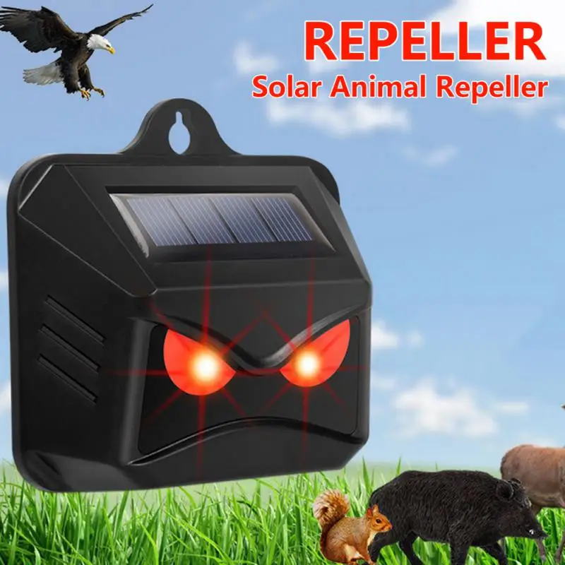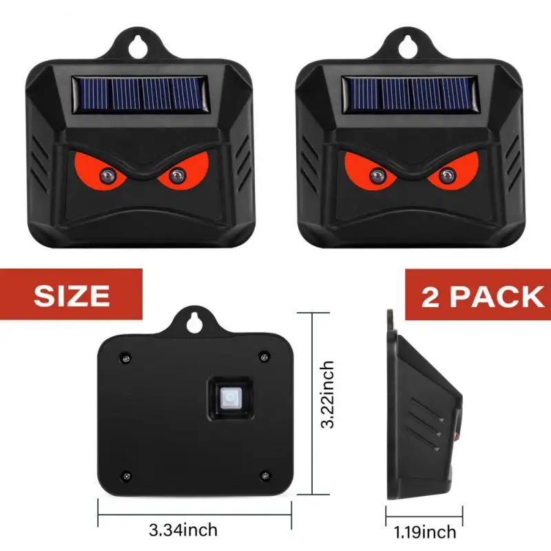1. Отпугиватель животных на солнечных батареях имеет 2 красных светодиодный стробоскоп вместо одного имитирует огонь или глаз хищника, чтобы более эффективно отпугивать животных в ночное время, таких как skunk, coyote, кролик, совы, енот, птица и т. д.