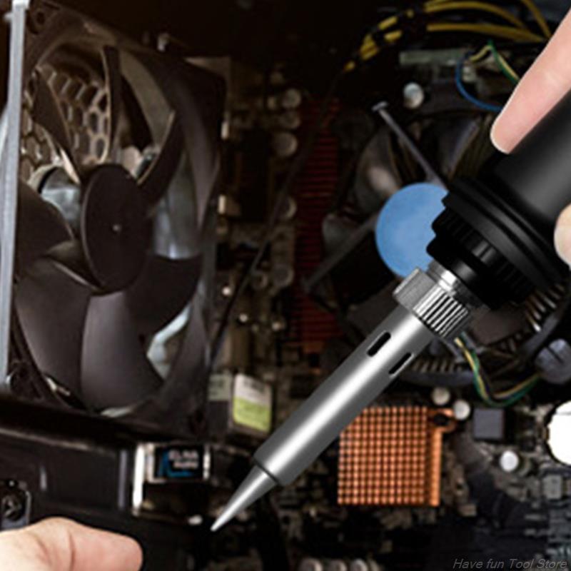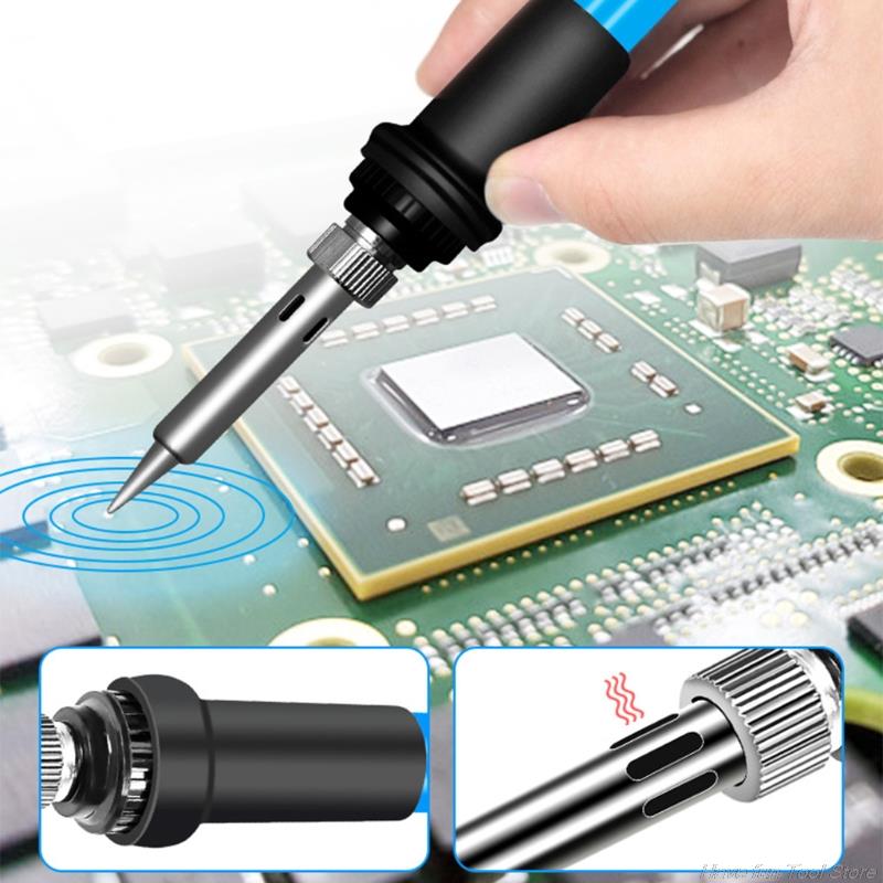 Профессиональный паяльник: паяльник с регулируемой температурой с большими отверстиями для отвода тепла, 60 Вт технология нагрева керамики, быстрый нагрев, энергосбережение и защита окружающей среды, после охлаждения головка паяльника может быть легко изменена. Диапазон регулируемой температуры паяльника составляет 200 °C-450 °C (392 °F до 842 °F).