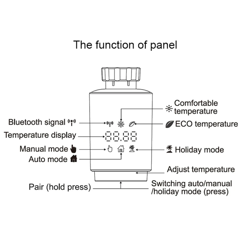 5. Обнаружение открытого окна: когда температура в помещении неожиданно падает в темп. Порог, клапан закроется в течение 15 минут. После этого, если температура в помещении. Все еще ниже, чем температура. Порог, он сохранит этот режим. Кроме того, его легко читать цифровой дисплей с температурой Цельсия.