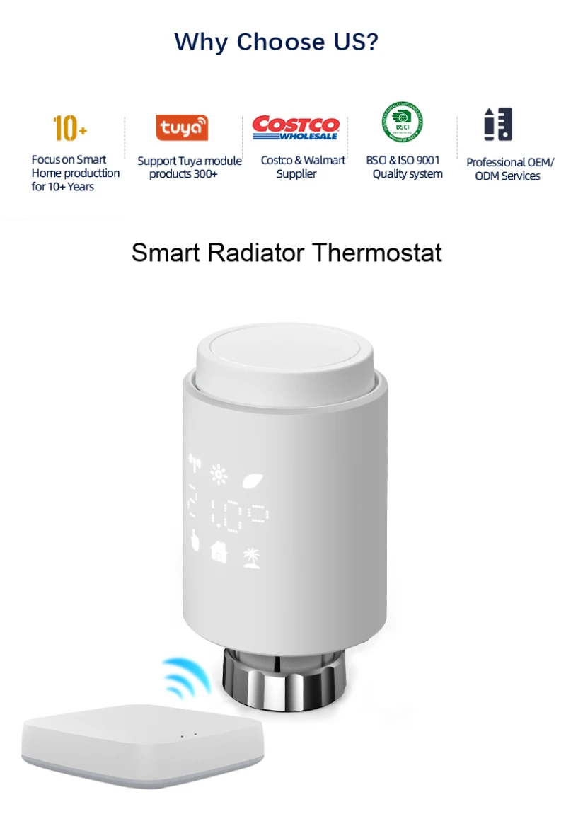 Клапан термостатического радиатора (TRV)-это саморегулирующийся клапан, устанавливаемый на радиатор системы отопления горячей воды, чтобы контролировать температуру комнаты, изменяя поток горячей воды на радиатор. С помощью TRV TV02 вы можете удобно регулировать температуру в помещении от 5 до 30 ℃ и экономить более 15% энергии.