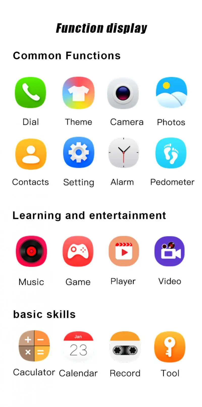 Телефонная книга, циферблат, камера, фотоальбом, воспроизведение видео, воспроизведение музыки, запись, калькулятор, календарь, будильник, фонарик, переключение темы, переключение циферблата, счетчик шагов, инструменты, несколько игр, несколько языков.