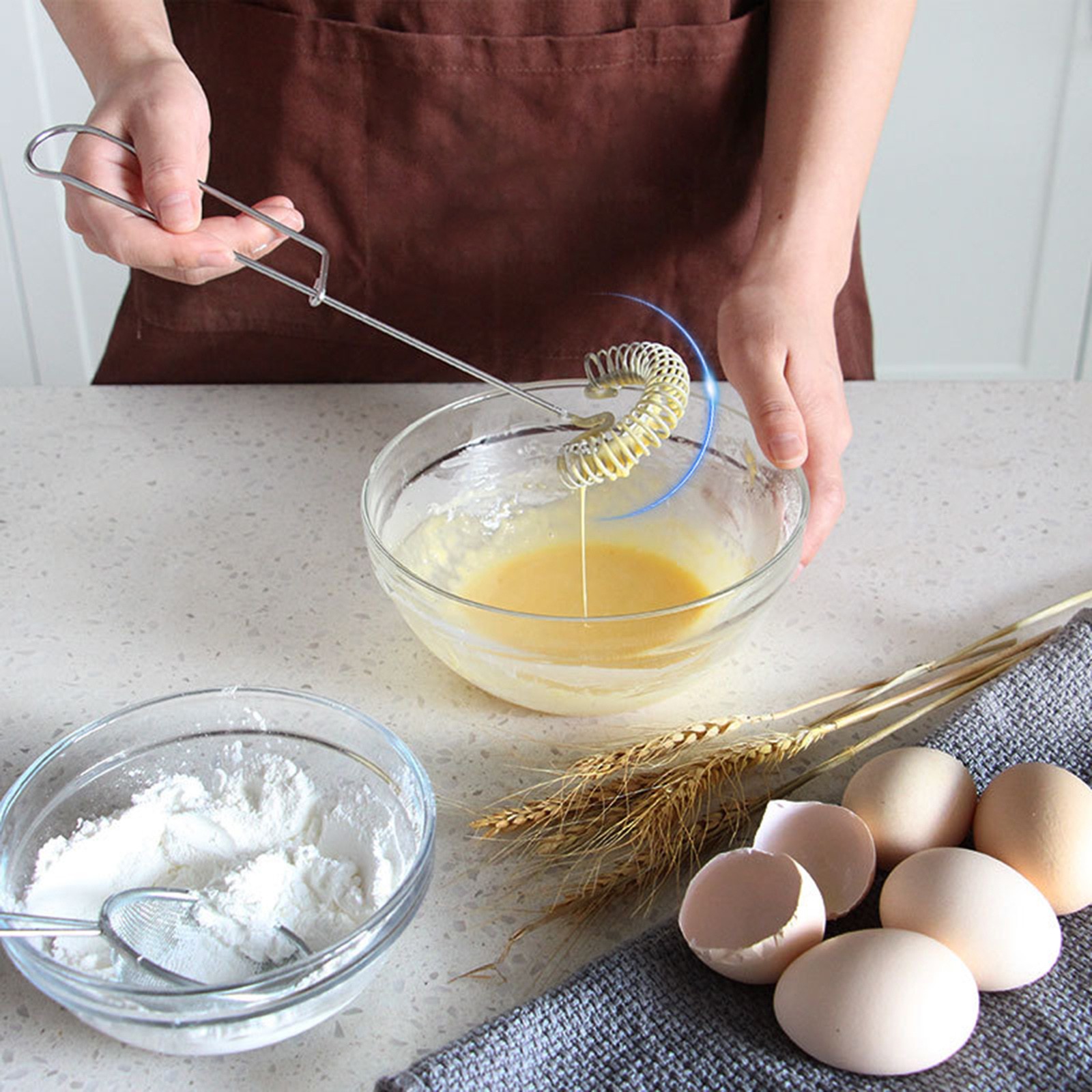 - Semi Automatic Eggs Whisk: Hand operated self rotating semi-automatic stainless steel whisk is a miracle design in the kitchen. It saves effort while gets the work done much faster than the general whisk without using electricity or battery. Simply press down the handle and the whisk stainless steel blades rotate, no more wrist spinning! The ergonomic handle provides secure and comfortable grip for any mixing task.