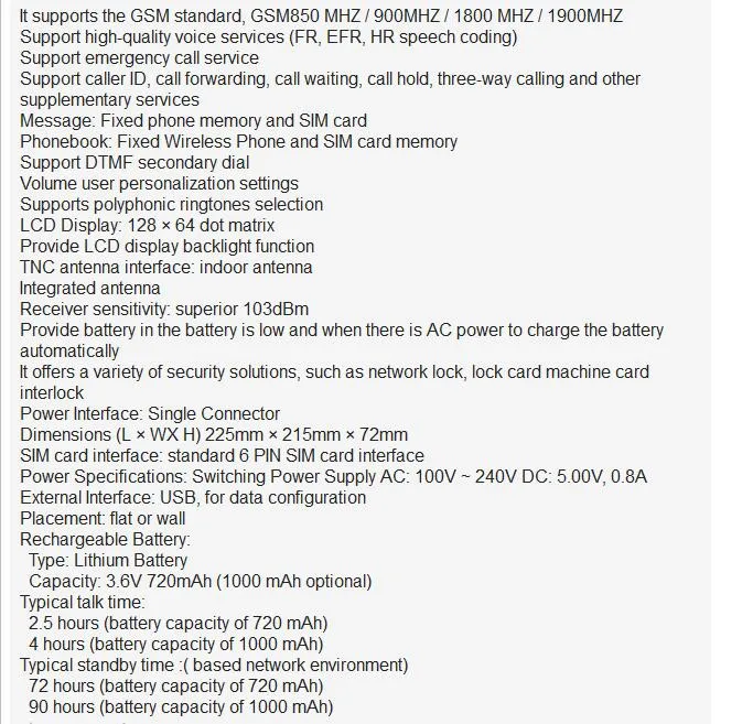 Startstar<;br/> Новая sim-карта Многофункциональный беспроводной телефон GSM Candybar беспроводной телефон фиксированный <;br/> Примечание: телефон нуждается в верхней сим-карте,<;br/> Элементы функции:<;br/> этот телефон является GSM беспроводной ручной многофункциональный телефон, элегантный внешний вид, обеспечивает основной голос, SMS, поддержка телефонной книги и SMS, сохраненные на sim-карте и беспроводном стационарном телефоне, две модели хранения, Семейные коммуникационные продукты идеальный выбор.<;br/> характеристики продукта:<;br/> посылка включает в себя:<;br/>1X телефон с/английским языком <;br/>1 * адаптер с европейской вилкой <;br/> Доставка <;br/>1. Доставка по всему миру. (За исключением некоторых стран andAPO/FP0)<;br/>2. Заказы обрабатываются своевременно после подтверждения оплаты.<;br/>3. Пожалуйста, внимательно проверьте свой адрес при оформлении заказа.<;br/>4. Если вы не получили ваш груз в течение 30 дней с момента оплаты, пожалуйста, свяжитесь с нами, мы будем отслеживать goodsand дать вам ответ как можно скорее. Наша цель-удовлетворение клиентов!<;br/>5. Из-за наличия в наличии и разницы во времени, мы выберем доставку Вашего товара с нашего первого доступного склада для быстрой доставки.<;br/>6. Мы отправляем по всему миру, транспортные режимы включают EMS,DHL,FEDEX,UPS,TNT, Почта Китая, HKPost и т. д. Мы отправляем заказы в течение 1-3 рабочих дней после подтверждения оплаты в нормальных условиях, все товары будут тщательно проверены, упакованы, а затем отправлены. <; Br/> Почта Китая <;br/> большинство стран в течение 15-30 дней <;br/>HK Post<;br/> большинство стран в течение 7-25 дней <;br/> Почта Швеции <;br/> большинство стран в течение 15-45 дней <;br/>DHL<;br/> большинство стран в пределах От 2 до 4 дней <;br/> Почта Сингапура <;br/> большинство стран в течение 15-35 дней <;br/>EMS<;br/> большинство стран в течение 6-8 дней <;br/> Оплата <;br/>1. Перед размещением заказа, пожалуйста, подтвердите цену и другие детали с поставщиком.<;br/>2. Пожалуйста, убедитесь, что вы прочитали все описание и согласны с сделкой перед покупкой.<;br/> Возврат и возврат <;br/>1. У вас есть 7 дней, чтобы связаться с нами и 30 дней, чтобы вернуть его со дня его получения, если этот товар находится в вашем распоряжении более 7 дней, это считается использованным, и мы не выдадим вам возврат или замену, никаких исключений нет! Стоимость доставки оплачивается как продавцом, так и покупателем пополам.<;br/>2. Все возвращенные товары должны быть в оригинальной упаковке, и вы больше всего предоставляете нам номер отслеживания, конкретную причину возврата и ваш po #.<;br/>3. Мы вернем вам полную сумму выигрышной ставки, после получения товара в оригинальном состоянии и упаковке со всеми компонентами и аксессуарами в комплекте, после того, как покупатель и продавец отменят сделку на Aliexpress или вы можете выбрать замену.<;br/>4. Мы будем нести все расходы по доставке, если товар (ы) является (являются) не как рекламируется <;br/>. Гарантия <;br/>1. 12 месяцев ограниченной гарантии производителя на дефектные изделия (за исключением предметов, поврежденных и/или неправильно использованных после получения). Аксессуары поставляются с 3-месячной гарантией.<;br/>2. Дефектные предметы должны быть зарегистрированы и возвращены в течение гарантийного срока (и в оригинальной упаковке, если это возможно). Вы должны сказать нам, что такое дефект и дать нам ваш номер заказа. Мы не ремонтируем и не заменяем товары с и