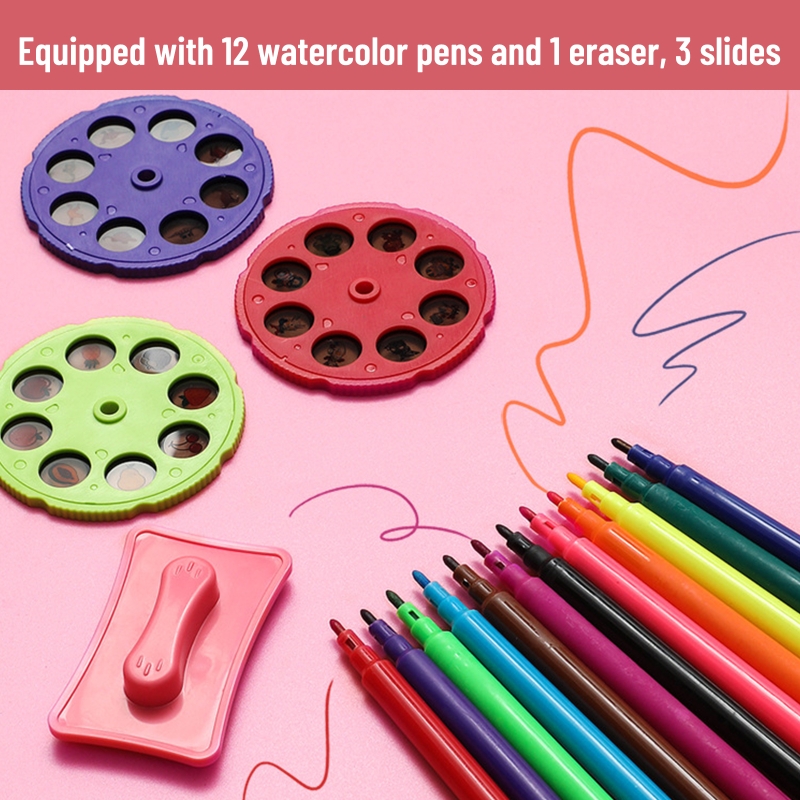 Простота в использовании: с 3 слайдами, посылка включает в себя 12 цветные ручки и 1 ластик. Очень легко и весело протирать и рисовать проекцией, просто нужно немного воды, вы можете очистить его с помощью ластика.