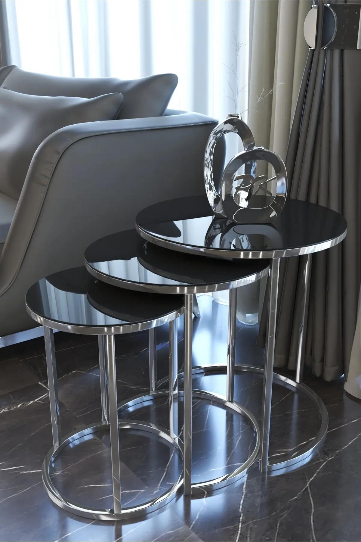 Самый маленький Журнальный столик: высота 50 см, диаметр зеркала 36,5 см.