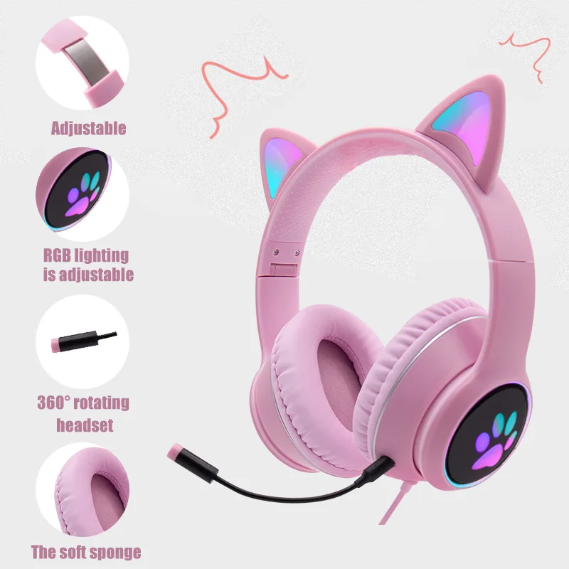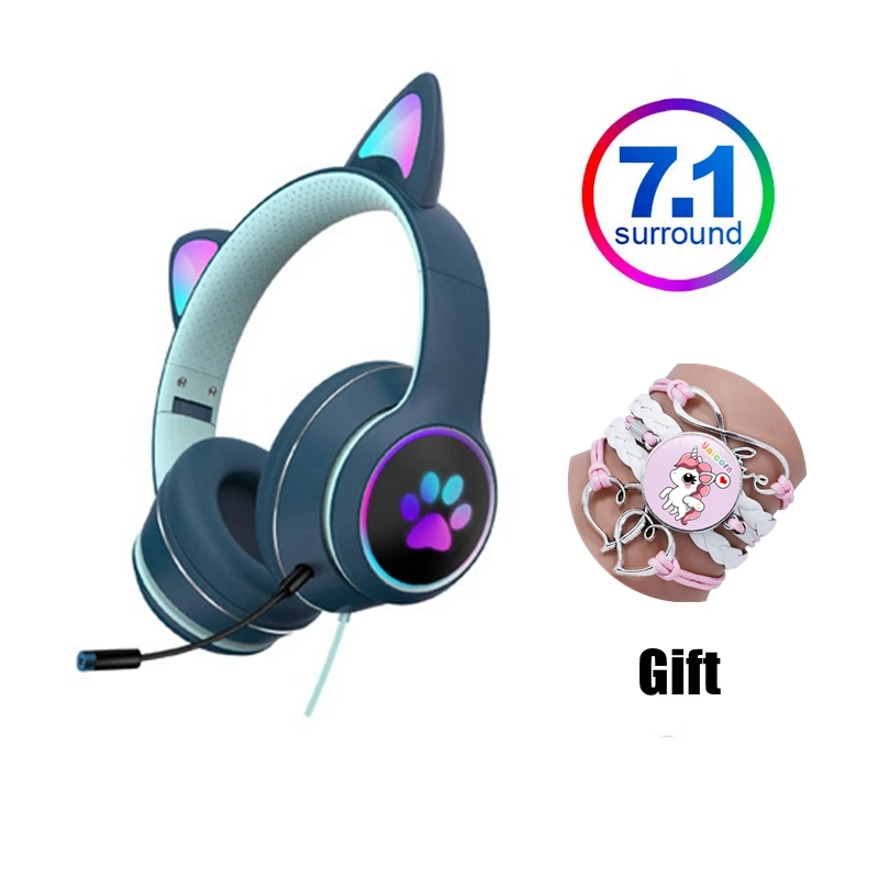 Кошачьими ушками на капюшоне, наушники для геймеров для девочек милые наушники двойной Шум-наушники с шумоподавлением С микрофоном RGB светильник виртуальной 7,1 Auriculares подарок <;br/> Если вам нужно изменить цвет браслет с единорогом, пожалуйста, обратите внимание.<;br/> Уважаемые покупатели, потому что вы покупаете гарнитура с внешний микрофон, пожалуйста, проверьте, правильно ли 3,5 мм интерфейс внешний микрофон пыльно-перед использованием его. Если есть пыль на 3,5 мм интерфейс, там будет микрофон с такими проблемами как микрофон гарнитуры шум при подключении.. <; Br/> Особенности:<;br/>-Высокая точность 40 мм драйвера, принесет вам яркое звуковое поле, четкость звука, ощущение звукового удара, способное к различным играм. Великолепная изоляция окружающего шума.<;br/>-с двумя микрофонами, поддержка стерео шумоподавления. Легко переключаться между играми и обучением.<;br/>-3,5 мм разъем, он подходит для iPhone, Samsung,LG, Xiaomi, iPad, ПК, ноутбука, планшета, И т. д.<;br/>-наушники, используемые с кожаным материалом, и супер мягкие Накладные амбушюры, которые более удобны для длительного ношения.<;br/>-яркие RGB огни разработаны на наушниках, подчеркнув атмосферу игры.<;br/>-линия оснащена поворотным регулятором громкости, одним ключом микрофона, Удобнее в использовании.<;br/>-изысканное мастерство и модный внешний вид.<;br/>-Высококачественная Милая игровая гарнитура RGB на ваш выбор.<;br/> Внимание:<;br/> светодиодный светильник может работать только при использовании usb-разъема наушников! Таким образом, если у PS4 нет разъема USB, когда вы используете наушники в PS4, это не будет светильник!<;br/> Каждый заказ на наушники 1 шт будет отправлен воздушной сумкой. Если вам нужна оригинальная коробка, пожалуйста, свяжитесь с нами, чтобы добавить деньги.<;br/> Если у вас есть какие-либо вопросы, пожалуйста, свяжитесь с нами для получения помощи! Мы сделаем все возможное, чтобы решить вашу проблему.<;br/> характеристики:<;br/> Цвет: розовый, серый, небесно-голубой, синий, черный <;br/> Тип ношения: Крепление на голову <;br/> гарнитура Длина кабеля: 1,2 m<;br/> сетчатый Вес (г): 375g<;br/> Микрофон: Встроенный микрофон + вставные микрофон <;br/> Объем Управление: Да <;br/> один ключ кнопка отключения звука: Да <;br/> проводной Управление: Поддержка <;br/> Тип штекера Тип: 3,5 мм <;br/> Диаметр динамика: 40 мм <;br/> Чувствительность: 115 дБ +/- 3 дБ <;br/> Сопротивление: 32 +/-15%<;br/> Частотная характеристика: 20-20 кГц <;br/> чувствительность микрофона: -38dB +/- 3dB<;br/> Сопротивление микрофона: 2,2 ком <;br/> направленность: всенаправленные <;br/> светодиодный Рабочее напряжение: DC5V +/- 5%<;br/> Рабочий ток: ниже 100 мА <;br/> интерфейс гарнитуры: USB (Подключите usb-разъем, светодиодный светильник включен, отключен, выключен) + 3,5 мм stere<;br/> дорогой покупатель, мы продаем эту ссылку без коробки. Если вам нужна коробка, пожалуйста, свяжитесь со службой поддержки клиентов, чтобы компенсировать разницу.