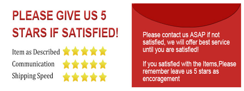 1. Пожалуйста, оставьте 5 звезд отзывы, если вы удовлетворены нашей продукцией и обслуживанием, Мы будем признательны (товар, как описано 5 звезд, связь 5 звезд, время доставки 5 звезд).