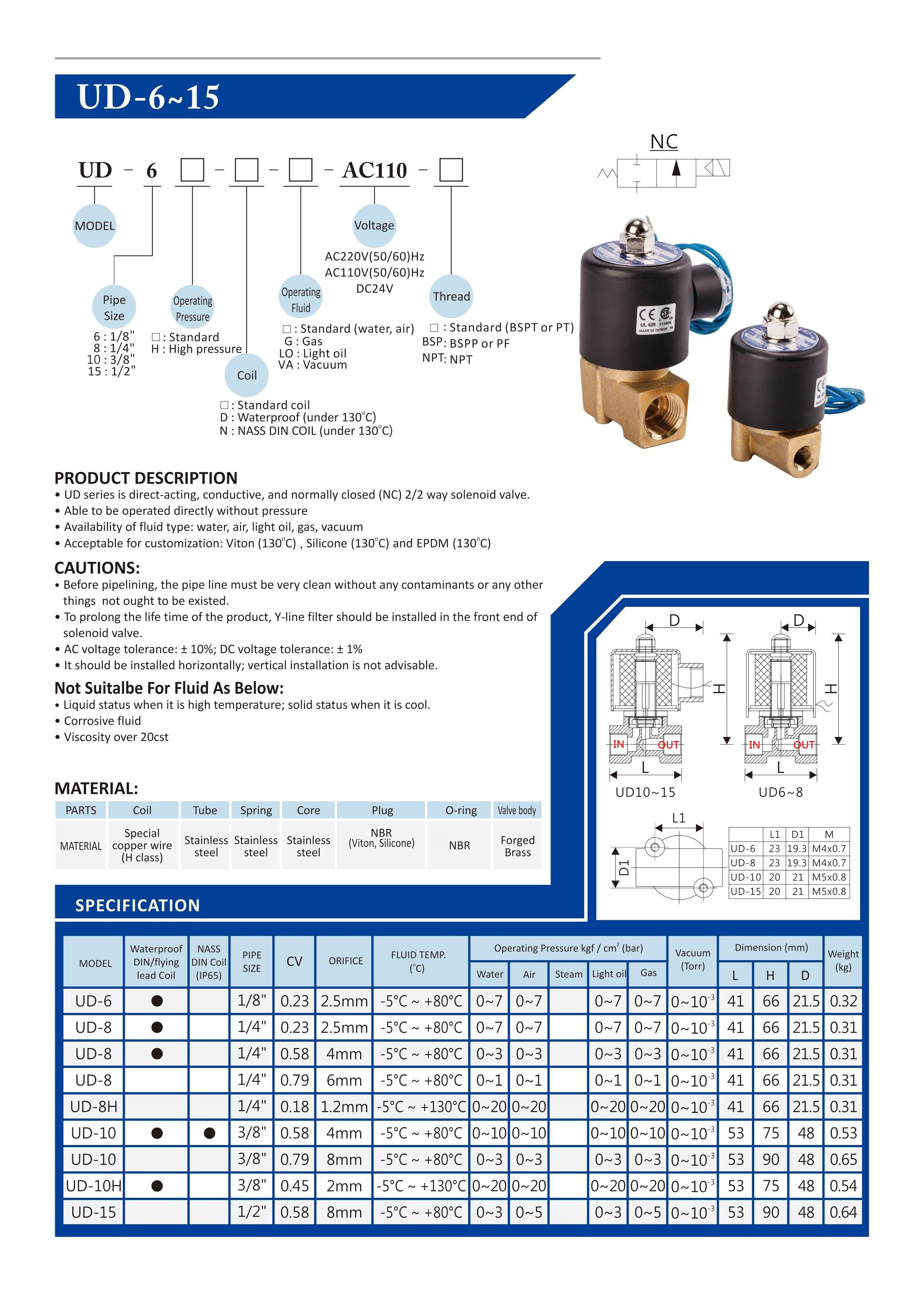 1. Серия UD имеет прямое действие, проводящий и нормально закрытый (NC) 2/2 ходовой Соленоидный клапан.