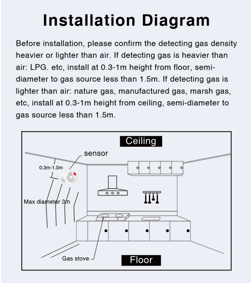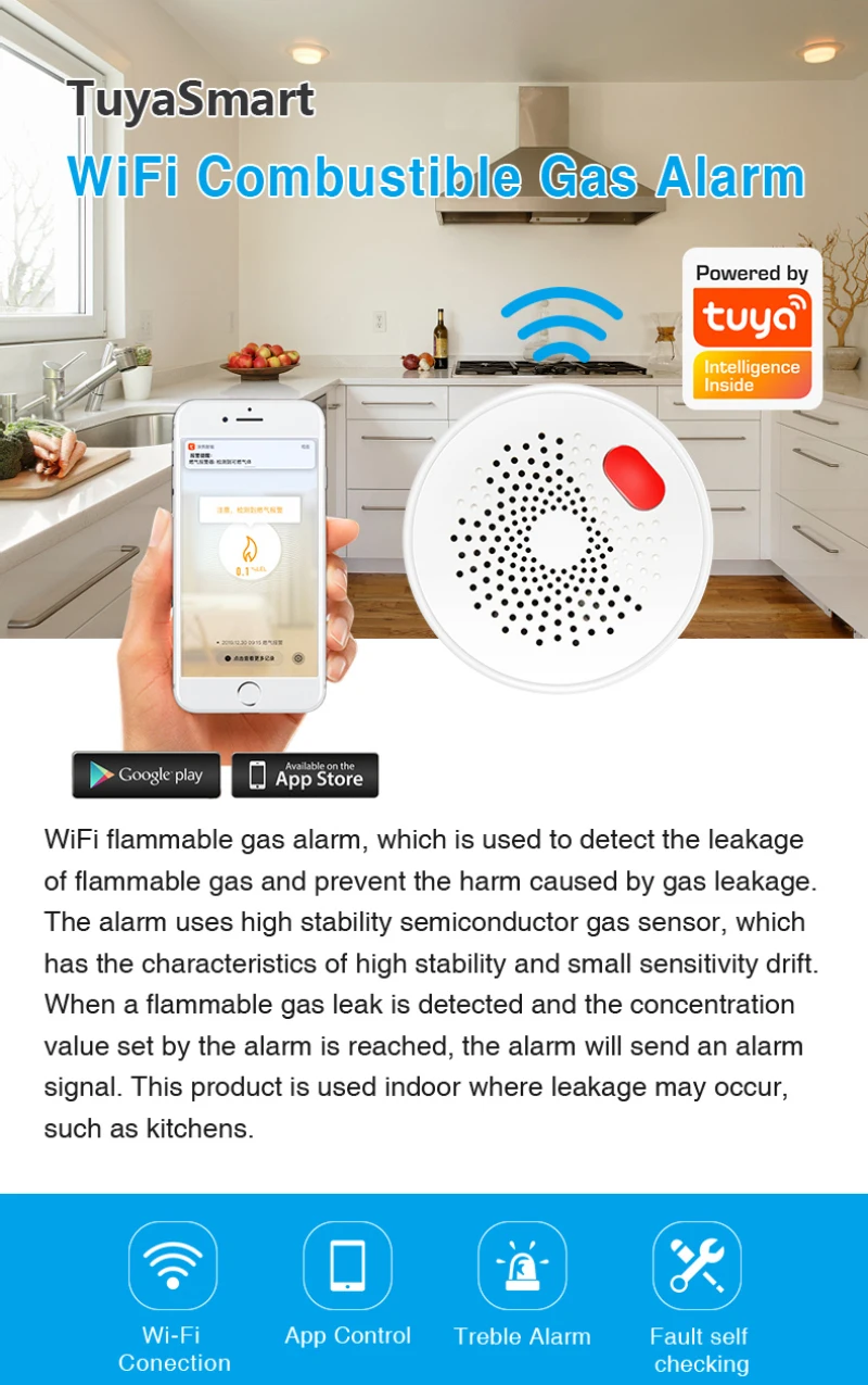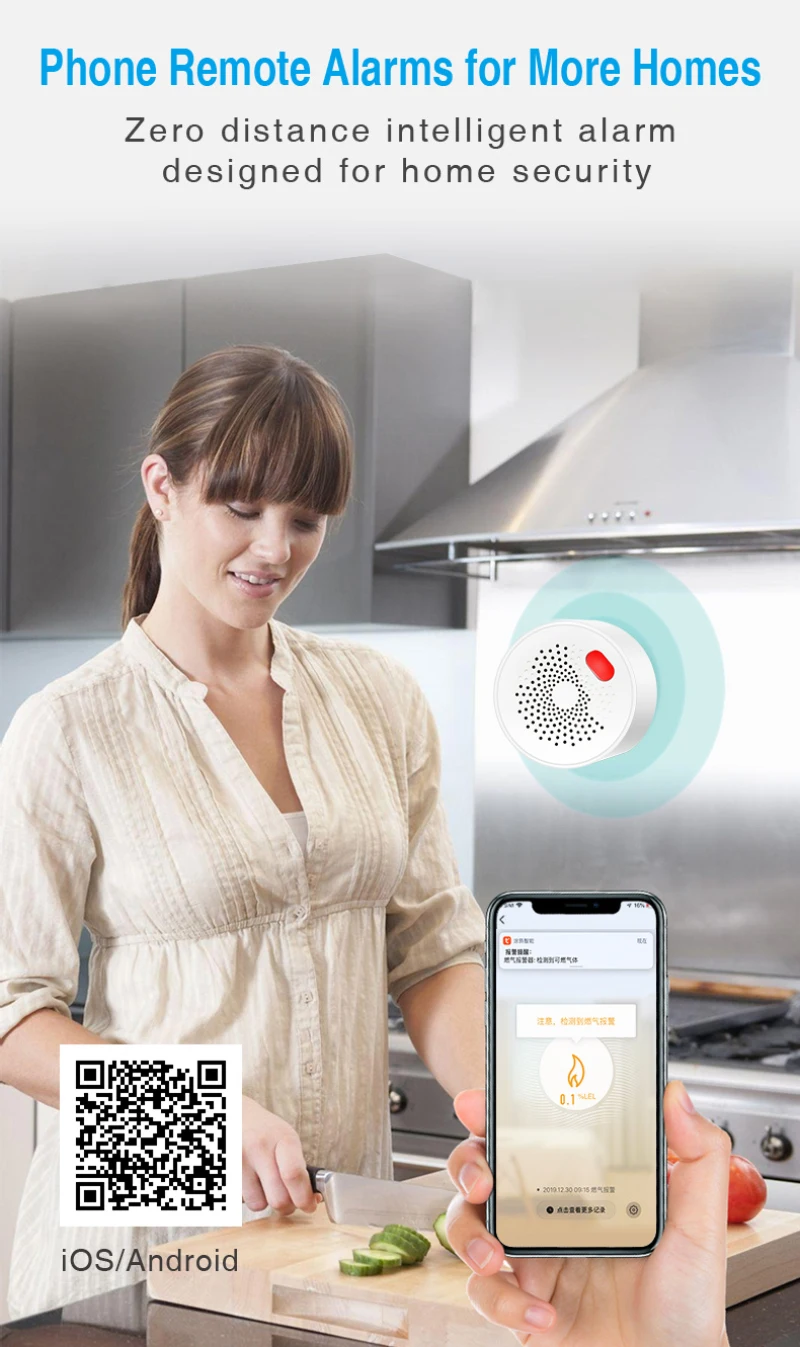WiFⅰ сигнализация на горючем газе используется для обнаружения утечки горючего газа и предотвращения опасности, вызванной утечкой газа. Сигнализация использует высокостабильные полупроводниковые газовые датчики, которые имеют характеристики высокой стабильности и небольшой чувствительности дрейфа. Когда газ протекает и достигает значения концентрации, установленного сигнализацией, будильник отправит сигнал тревоги. Этот продукт используется на кухне и в других внутренних местах, где может возникнуть утечка.
