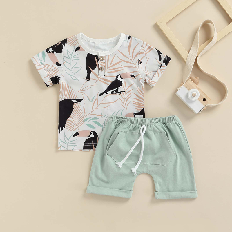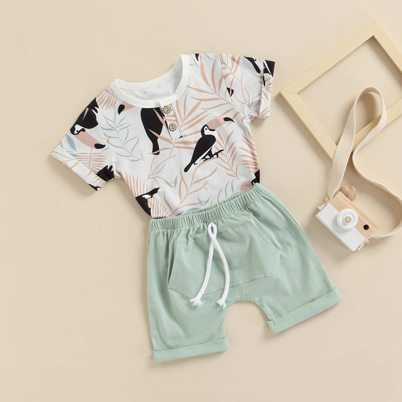 Летняя одежда для маленьких мальчиков футболка с короткими рукавами и принтом птицы на 1/4 пуговице топы и шорты на завязках с карманами