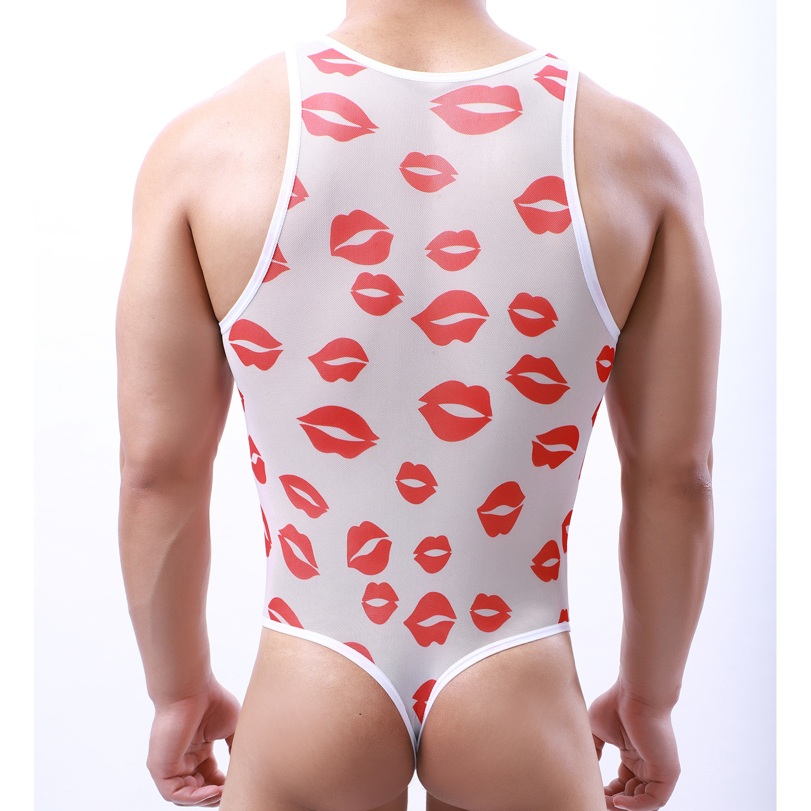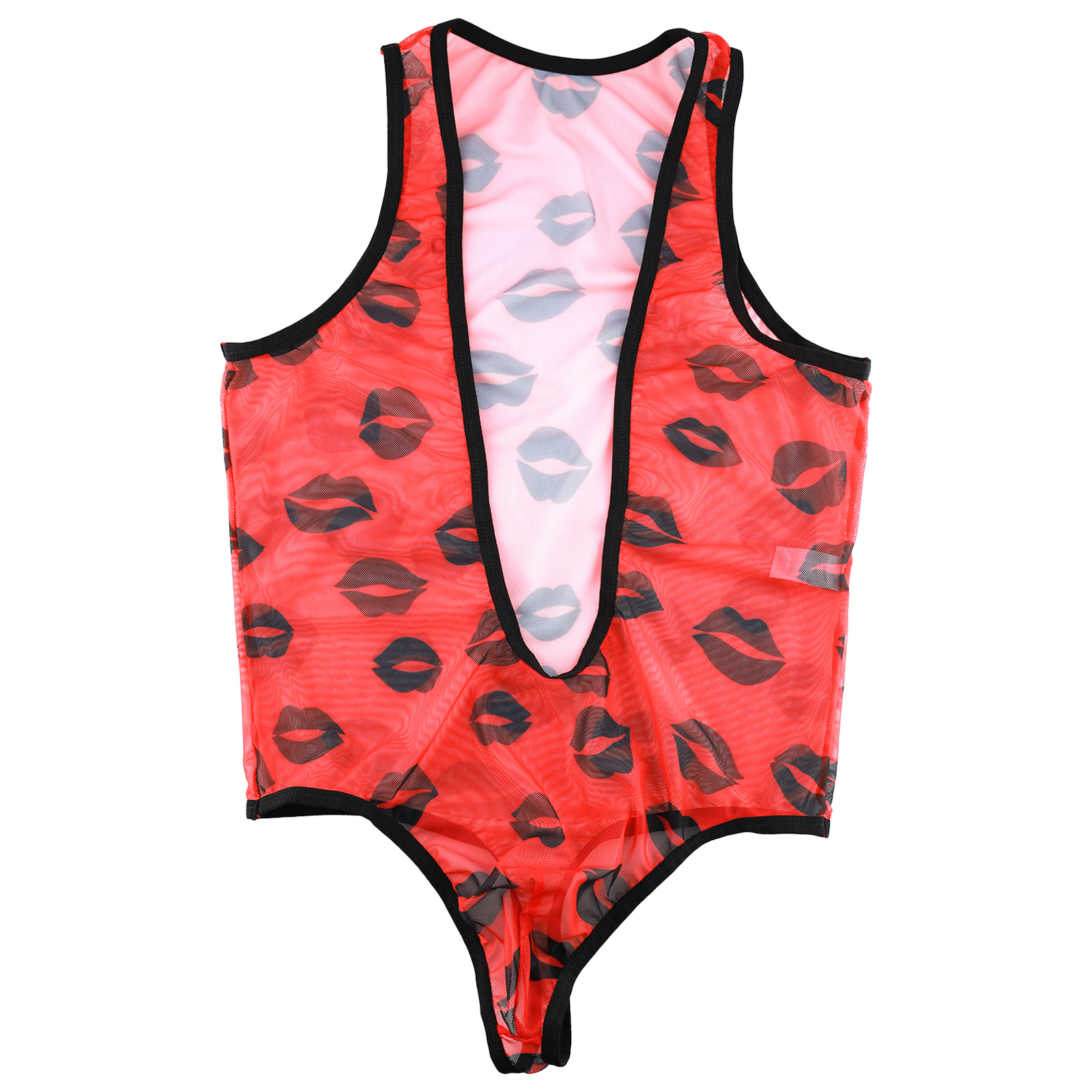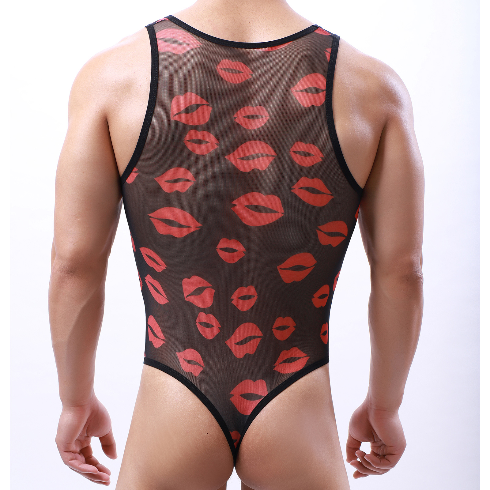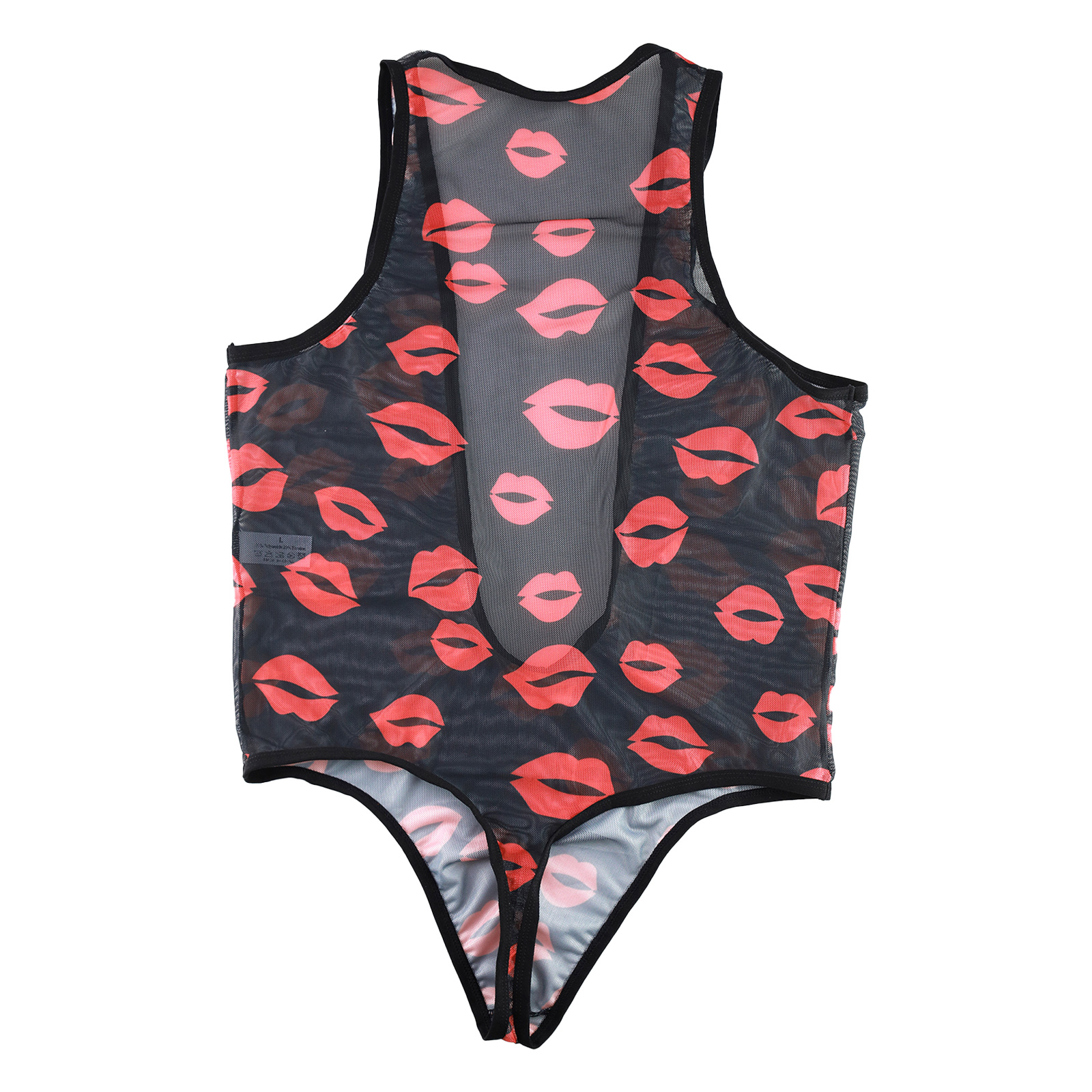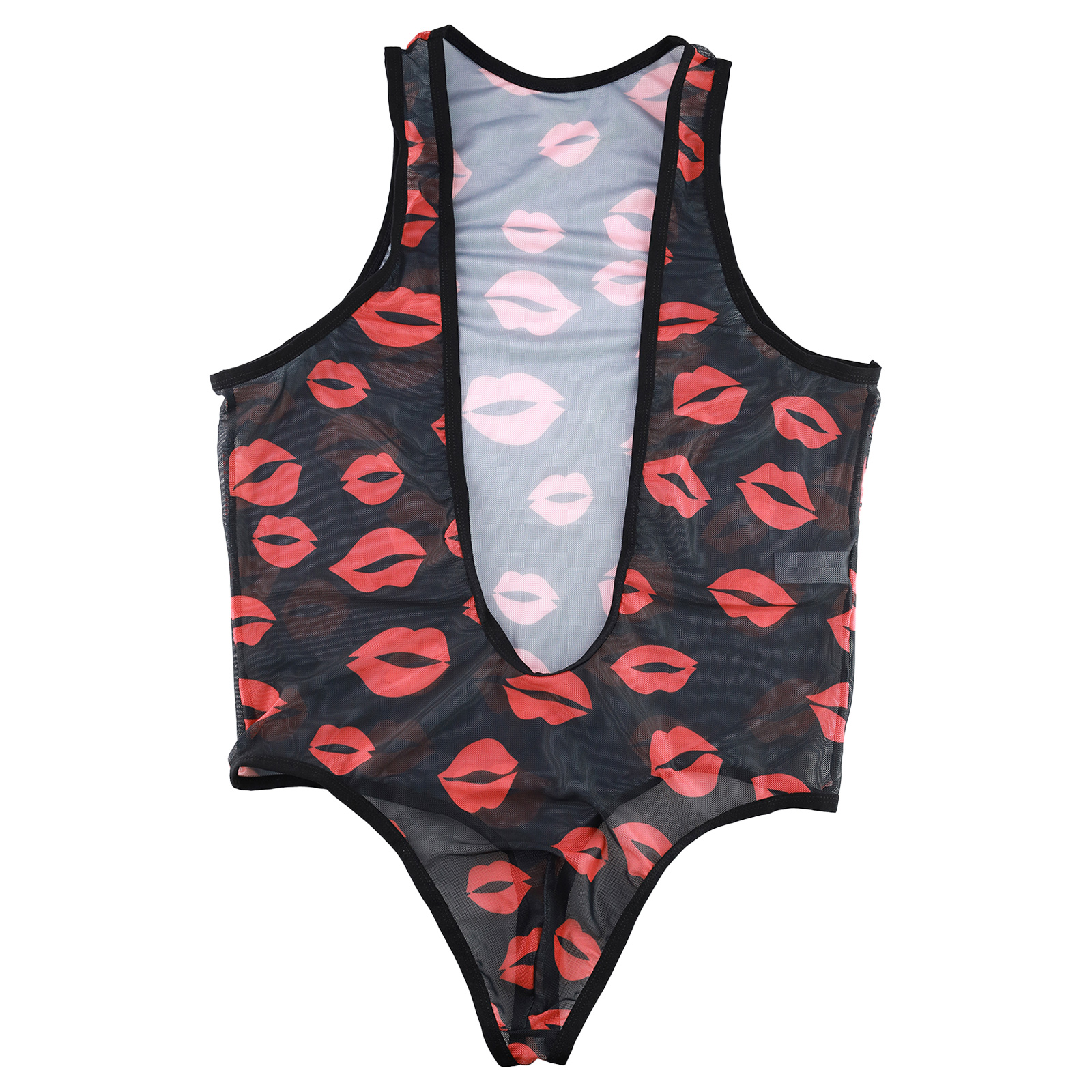 Мужской купальник без рукавов с принтом губ и глубоким вырезом.
