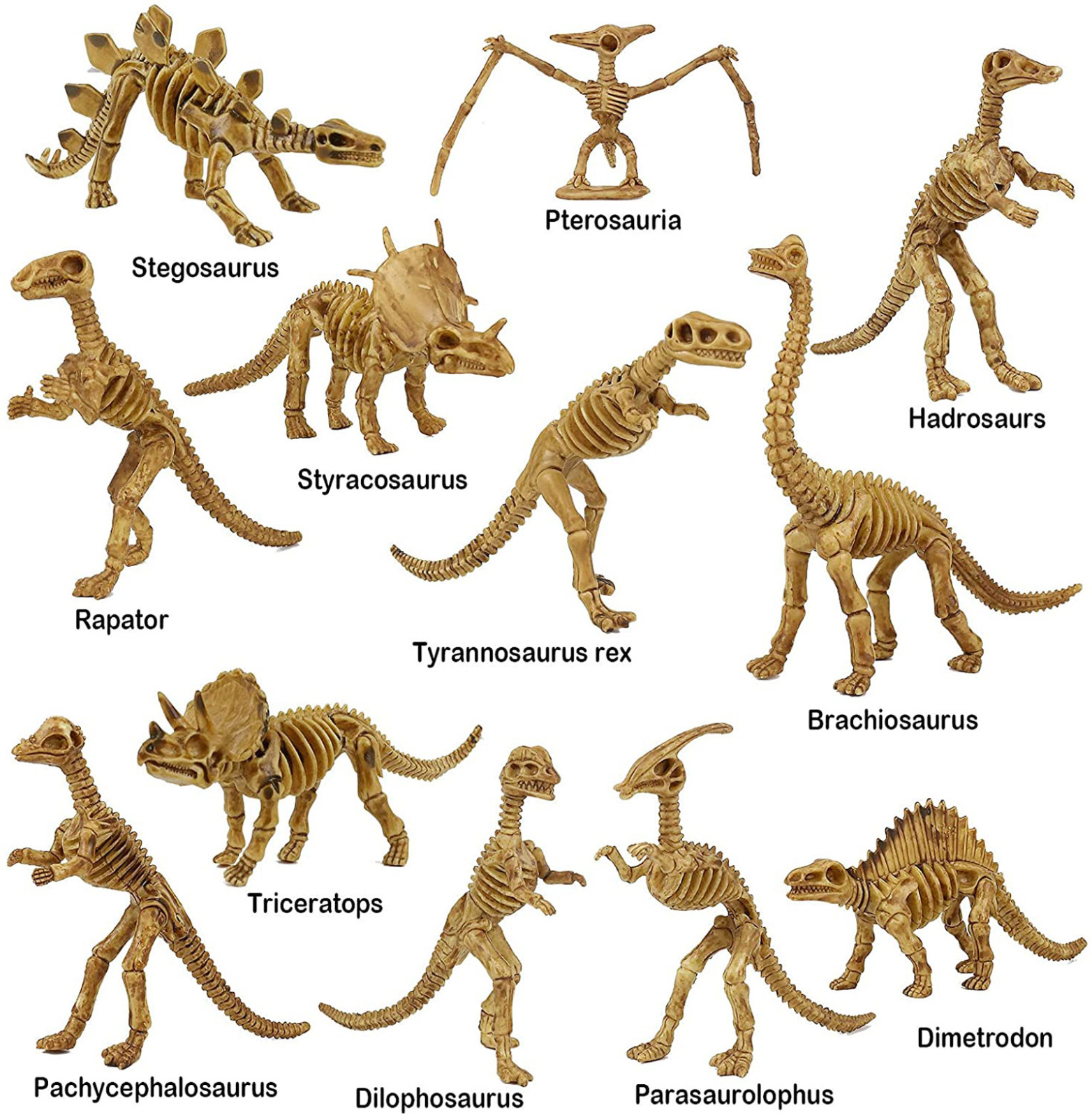 Pack of 12:Plastic dinosaur fossil skeleton, with a collection of different styles of dinosaurs, including Tyrannosaurus, Stegosaurus, Pterodactyl, Triceratops, Ornithopterus, Crownsaurus and more.