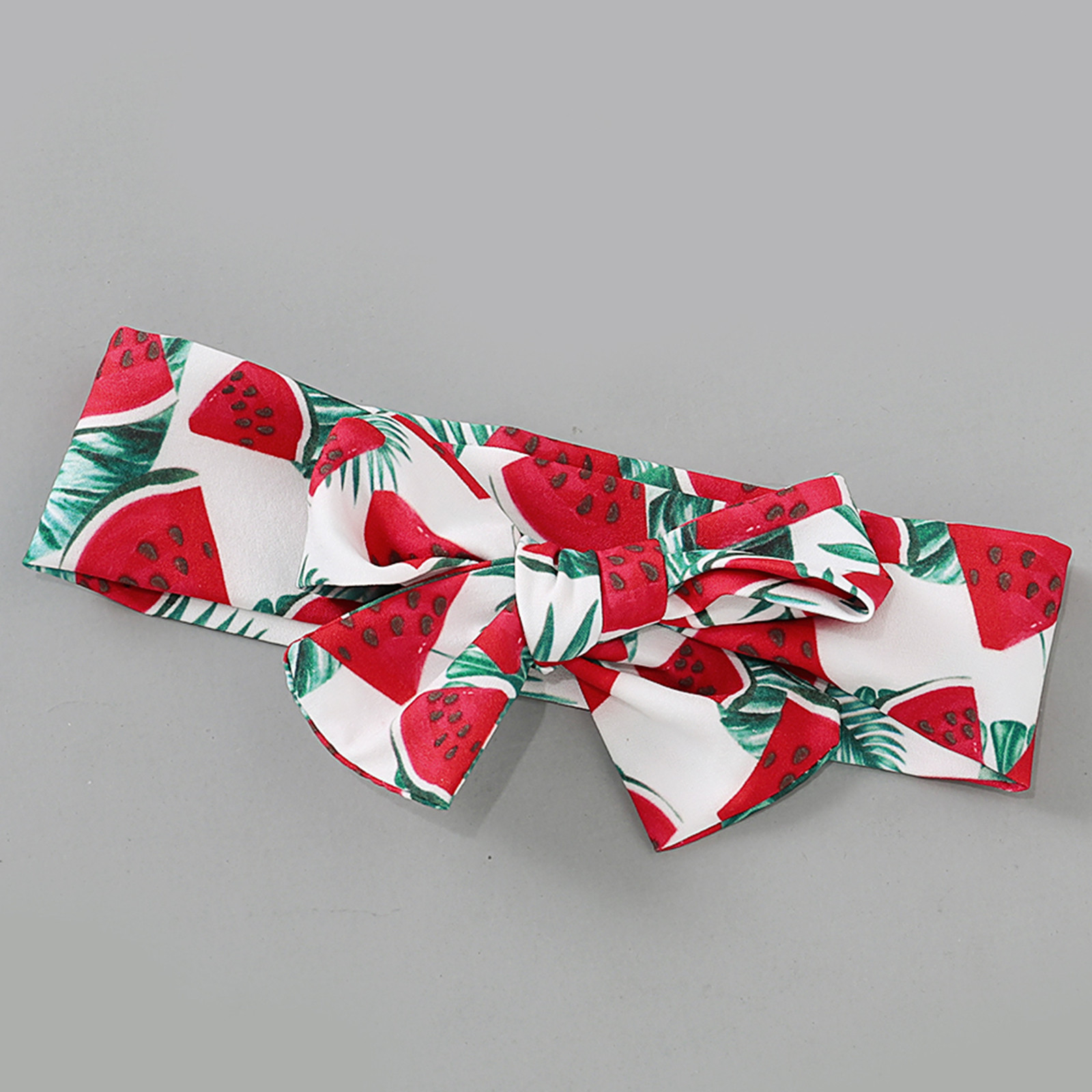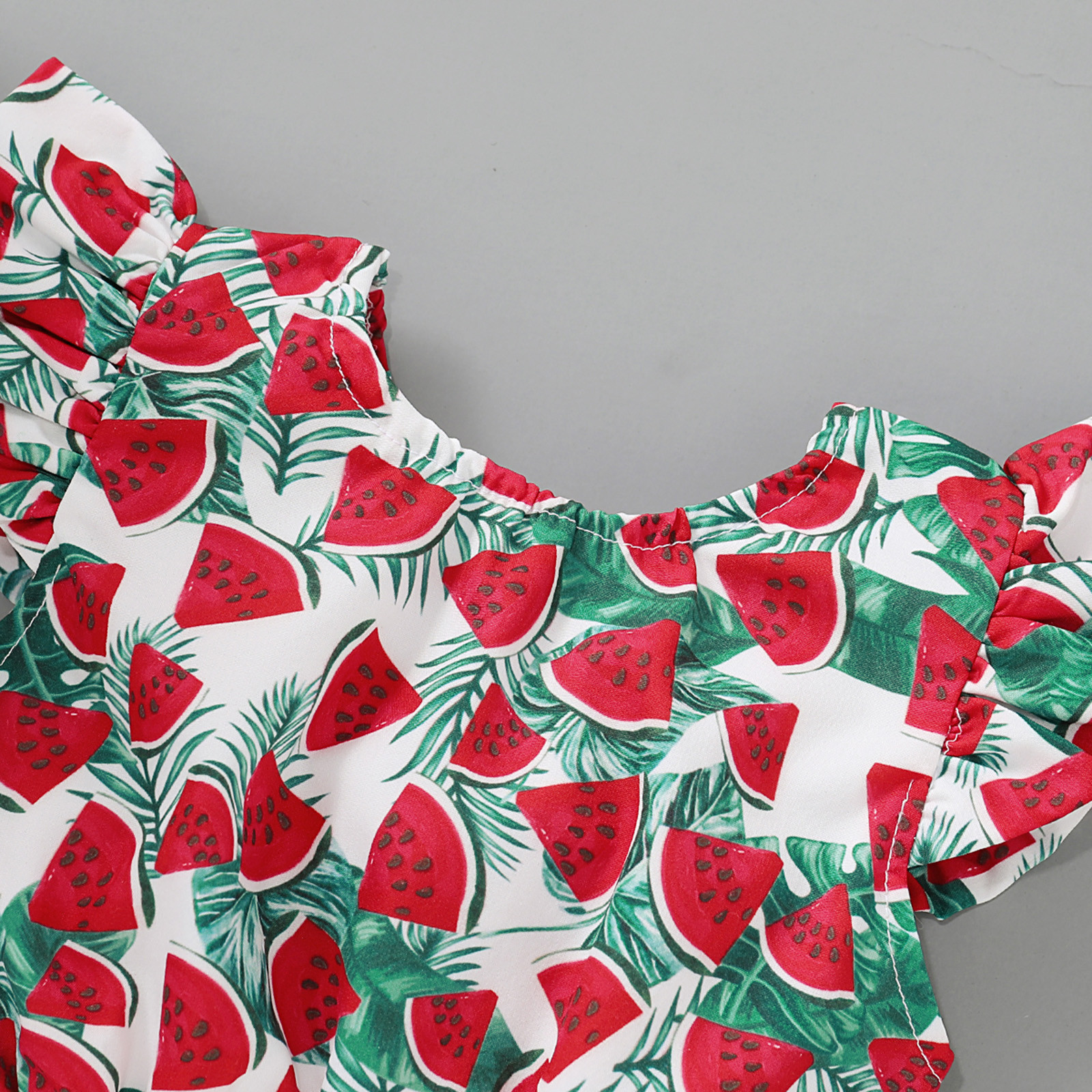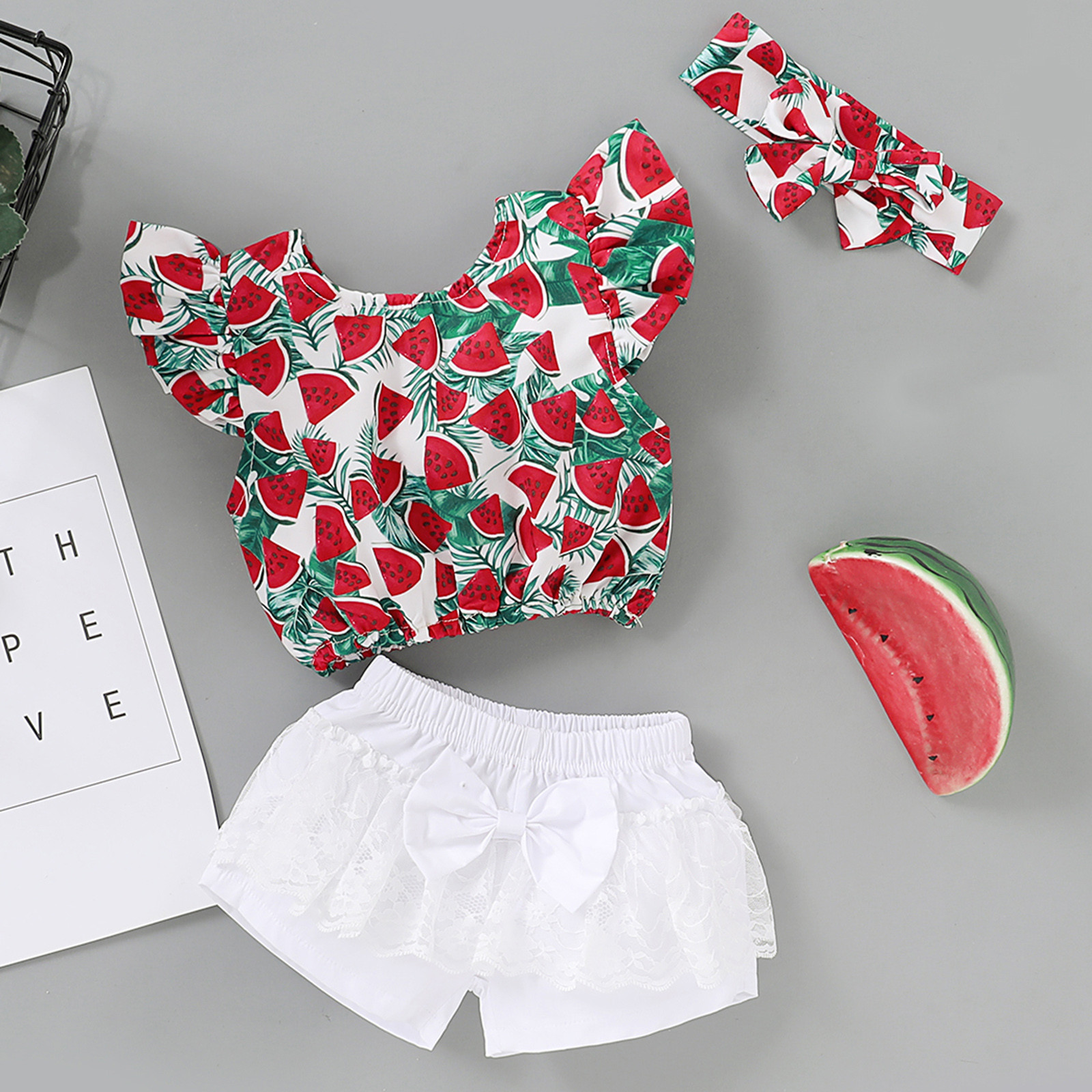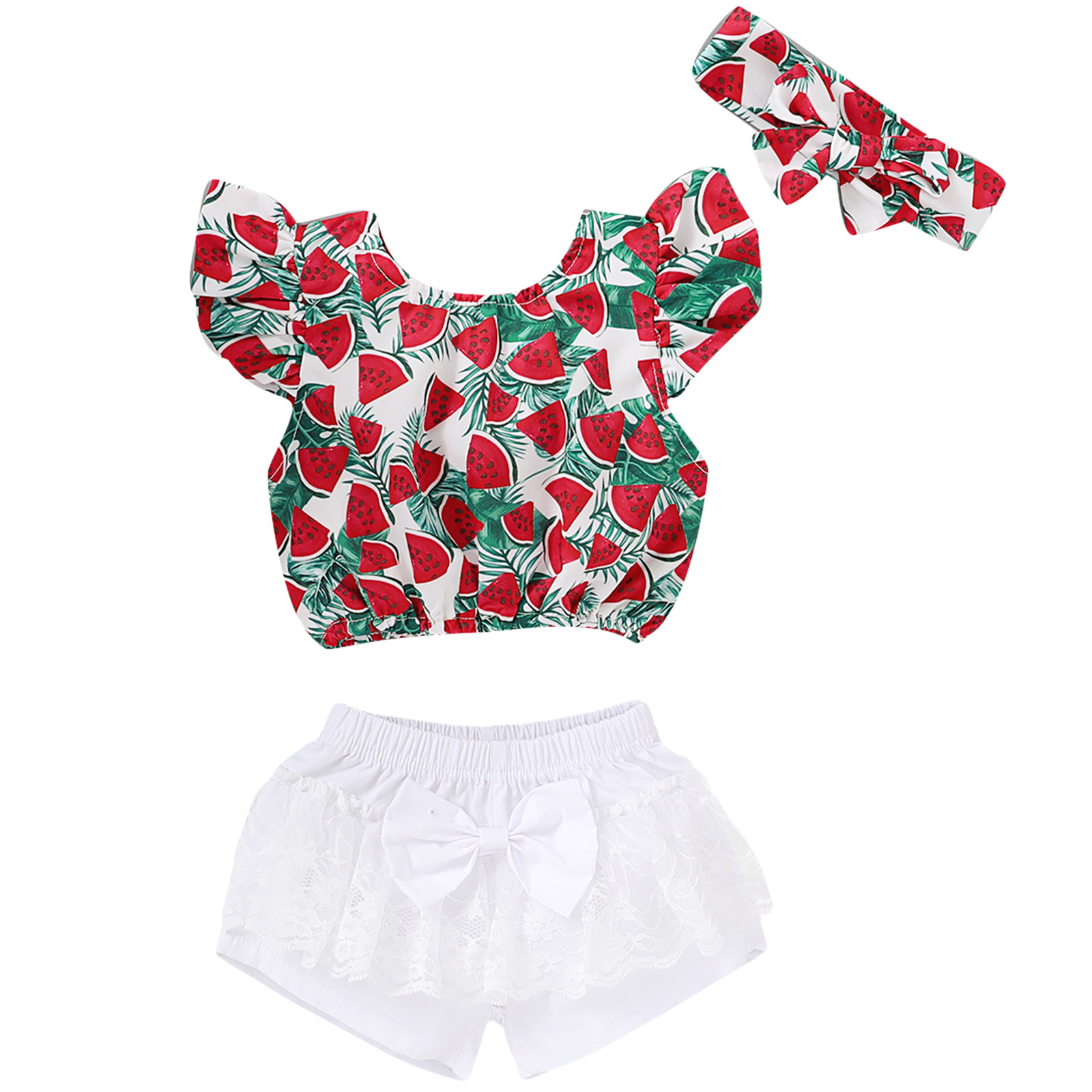 От 6 месяцев до 4 лет Одежда для маленьких девочек Футболка с оборками и рисунком арбуза Топы + белые шорты с бантиком + повязка на голову, летняя одежда conjunto Nina
