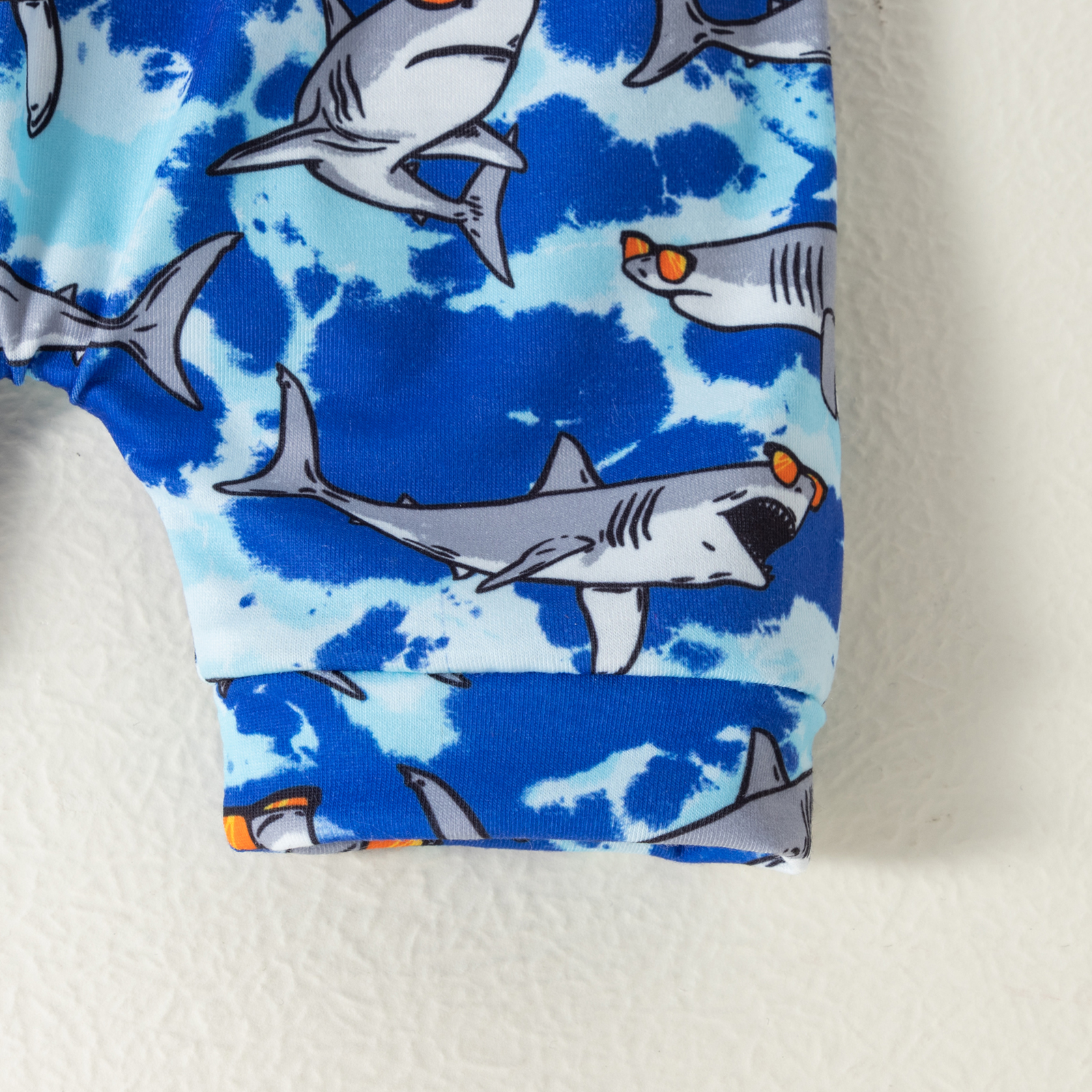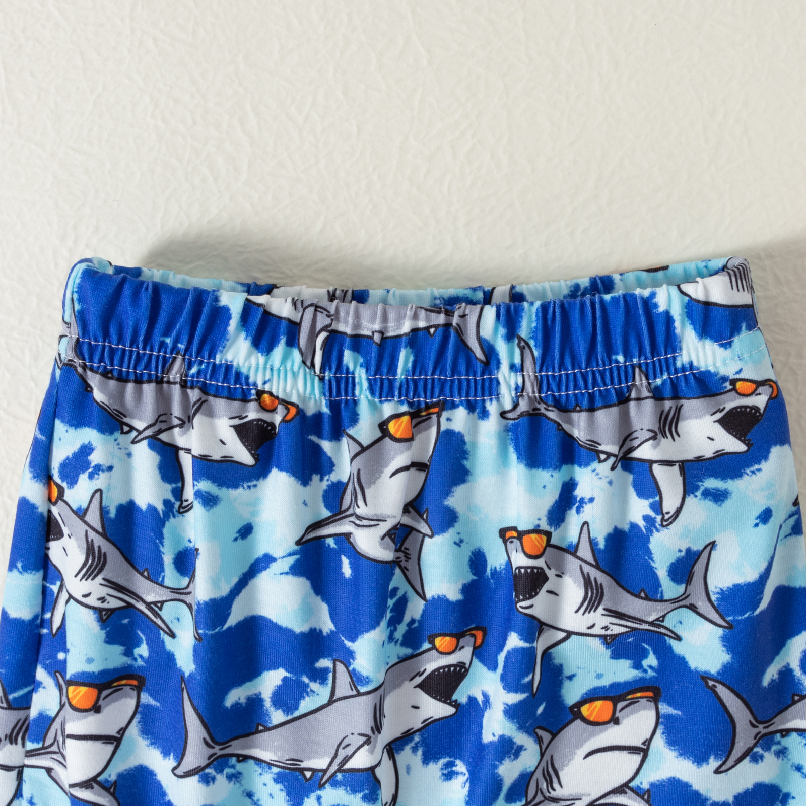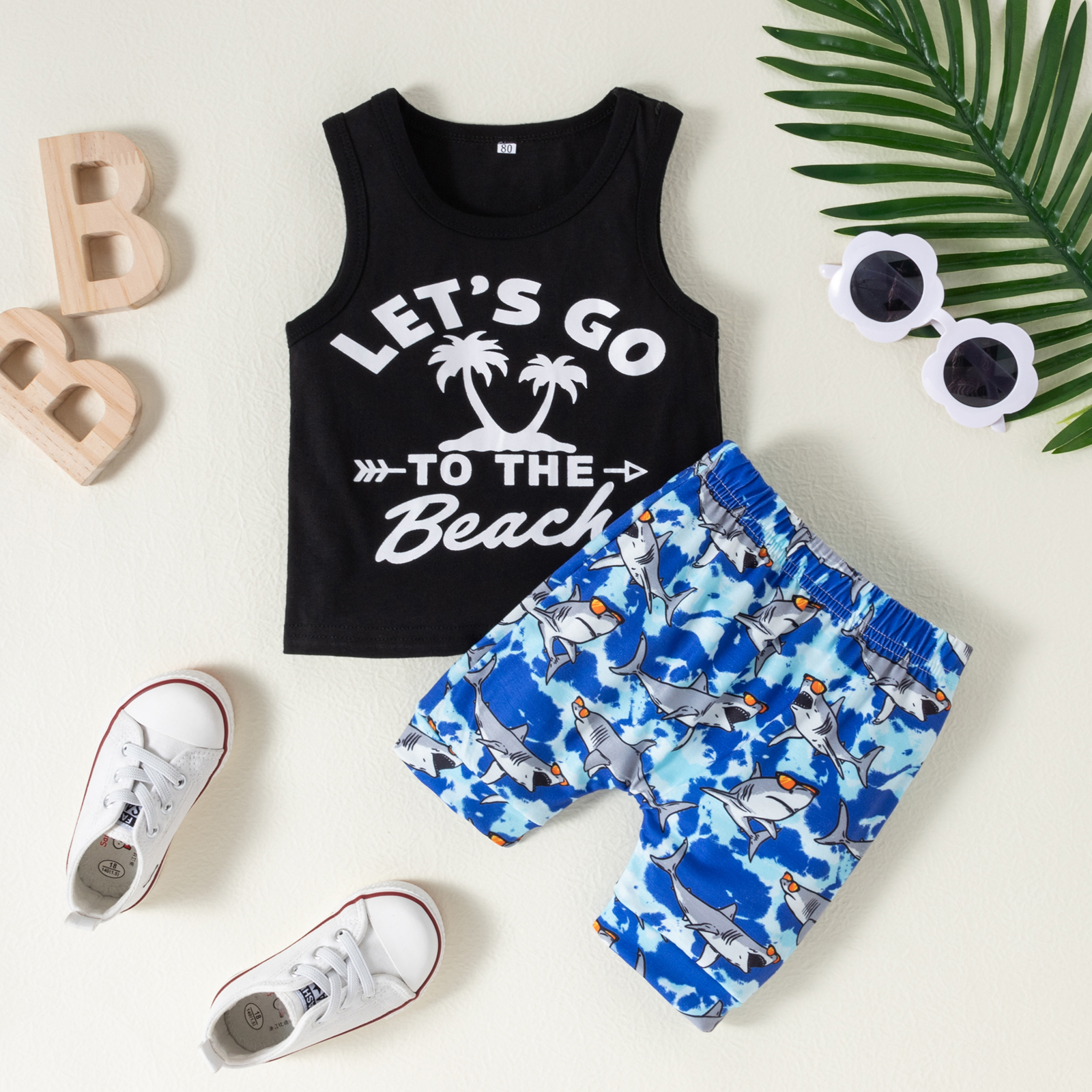 Детский топ с круглым вырезом и надписью + короткие штаны с принтом акулы