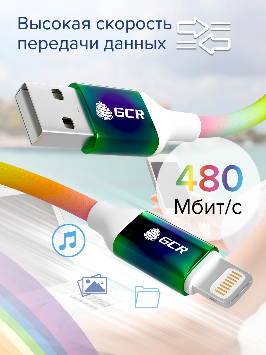 Современный практичный кабель GCR Lightning предназначен для зарядки iPhone 12/11/X/8/7/6/5, iPad и скоростной передачи данных по стандарту USB 2.0. Кабель обладает встроенным 75 MFI, поддерживает последние версии iOS, а потому универсален для мобильных устройств Apple.Особенности:*Max 2.4A*Высокая скорость передачи данных: 480 Мбит/с*Качественные материалы и сборка*Повышенная гибкость и прочность*Фиксатор от залома: защита кабеля*Экологичная яркая текстильная защита*Надежный алюминиевый корпус*Стильный внешний видКабель Lightning обеспечивает высокую скорость передачи данных до 480 Мбит/с для мгновенной загрузки музыки, фотографий и видео на IPhone, а также скоростную зарядку телефона при использовании адаптера питания от 18 W. Надежный металлический корпус защищает провод от повреждений. Специальный фиксатор препятствует заломам и перегибам в области коннектора.Оболочка кабеля изготовлена из приятной на ощупь текстильной оплетки и мягкого экологичного TPE пластика, соответствующего европейскому стандарту RoHS. Проводник из бескислородной меди обеспечивает стабильную передачу цифрового сигнала. Экранирование прекрасно защищает от электромагнитных помех.Яркий радужный дизайн изделия не оставит равнодушными ни взрослых, ни детей. Кабель точно не затеряется среди других проводов.