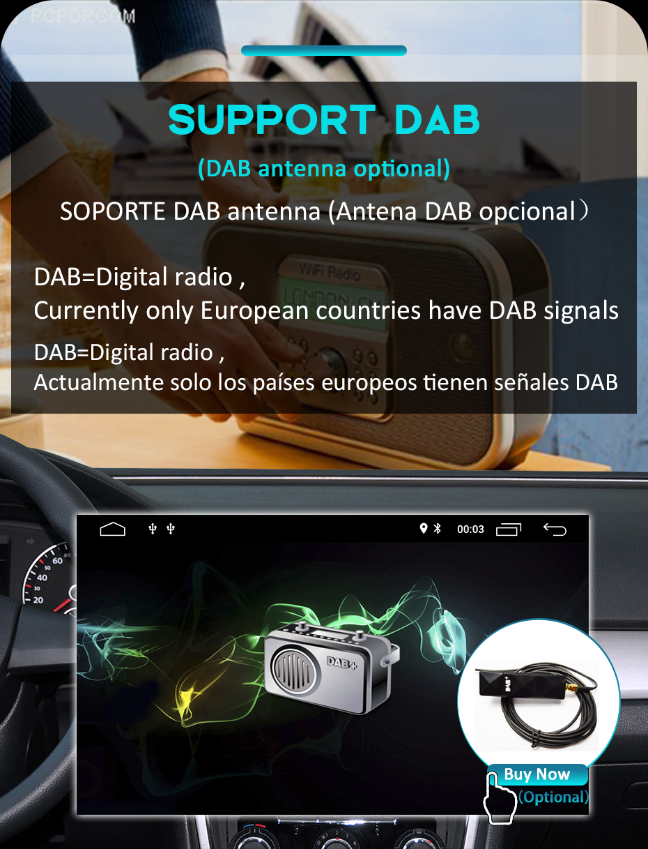 DAB-Это цифровое радио. Если в вашем городе есть цифровой радиосигнал, мы предлагаем вам купить DAB антенну, это гораздо лучше, чем FM AM RDS, он работает идеально без шума. Если нет цифрового радиосигнала, пожалуйста, не покупайте его.