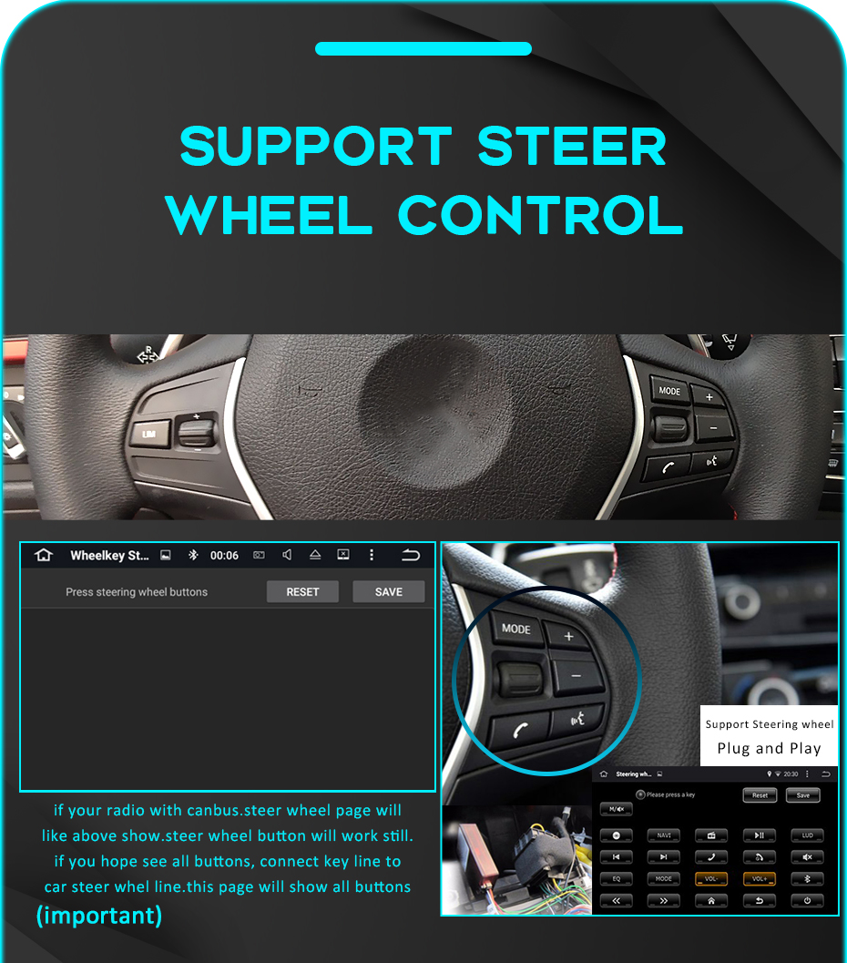 Функция управления поворотным колесом радиоподдержки. Пожалуйста, подключите ключевую линию к линии управления колесом автомобиля, затем ваши кнопки рулевого колеса автомобиля могут управлять нашим радио после установки радио.