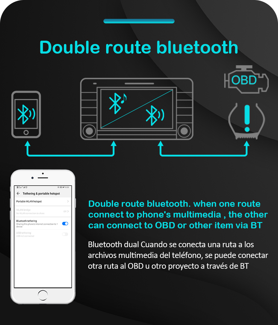 Когда один из маршрута подключается к мультимедиа телефона, другой может подключаться к OBD или другому товару через bluetooth.