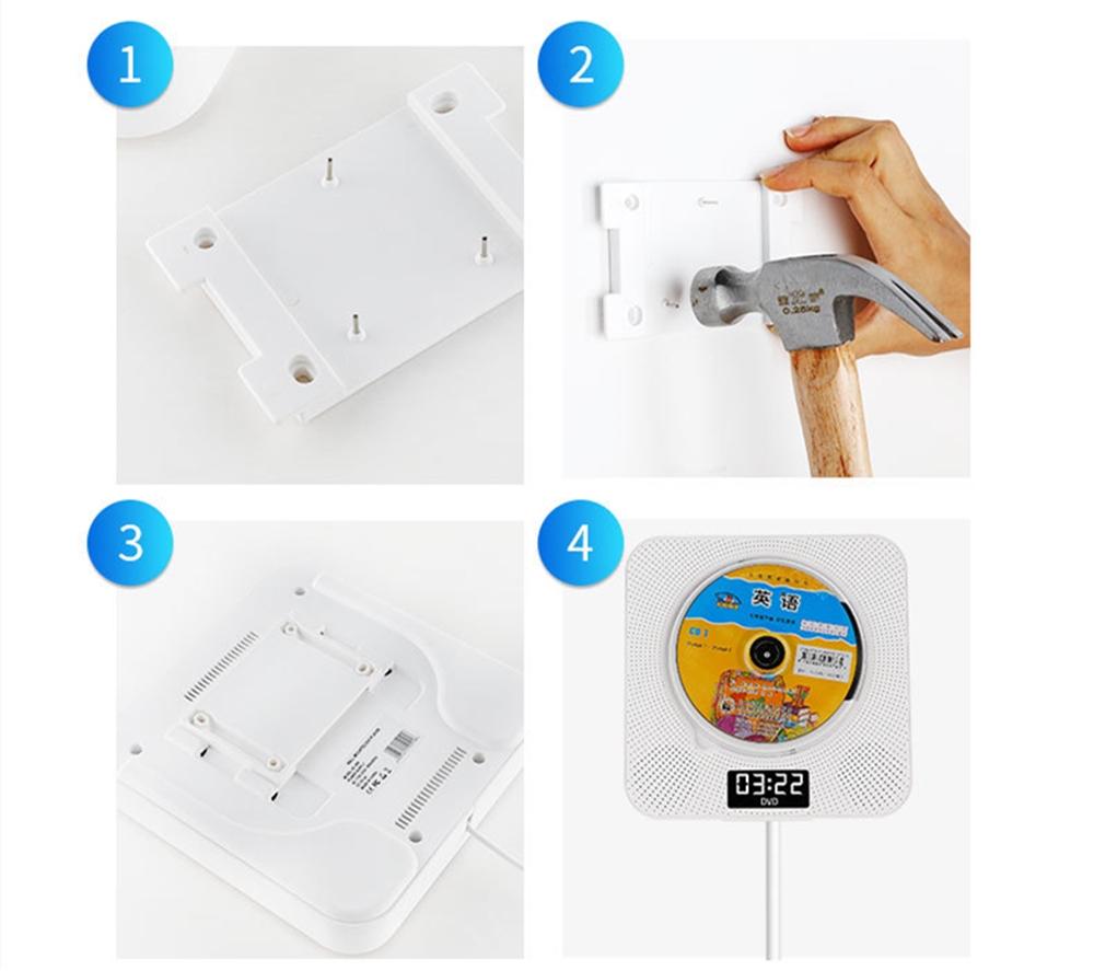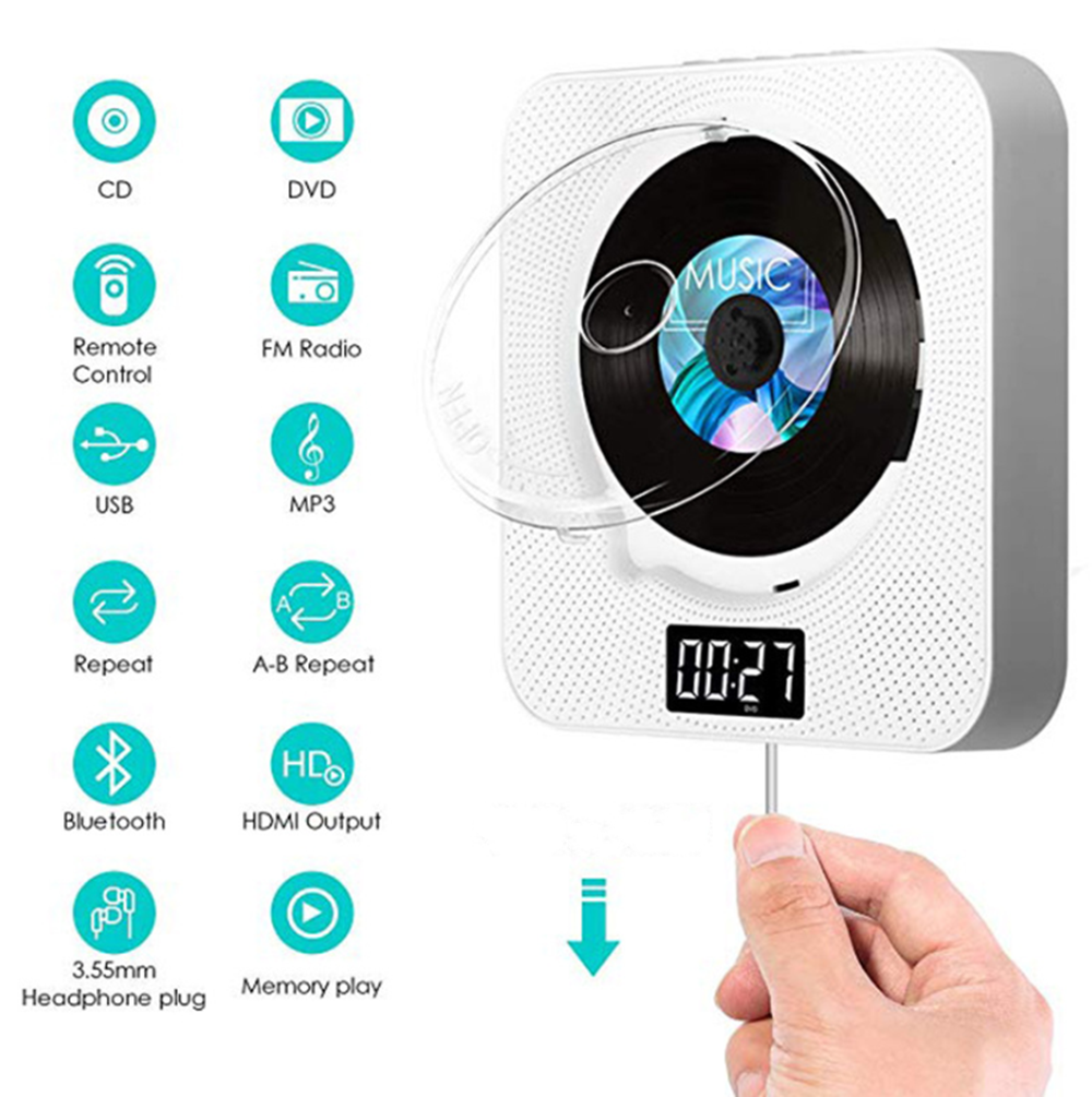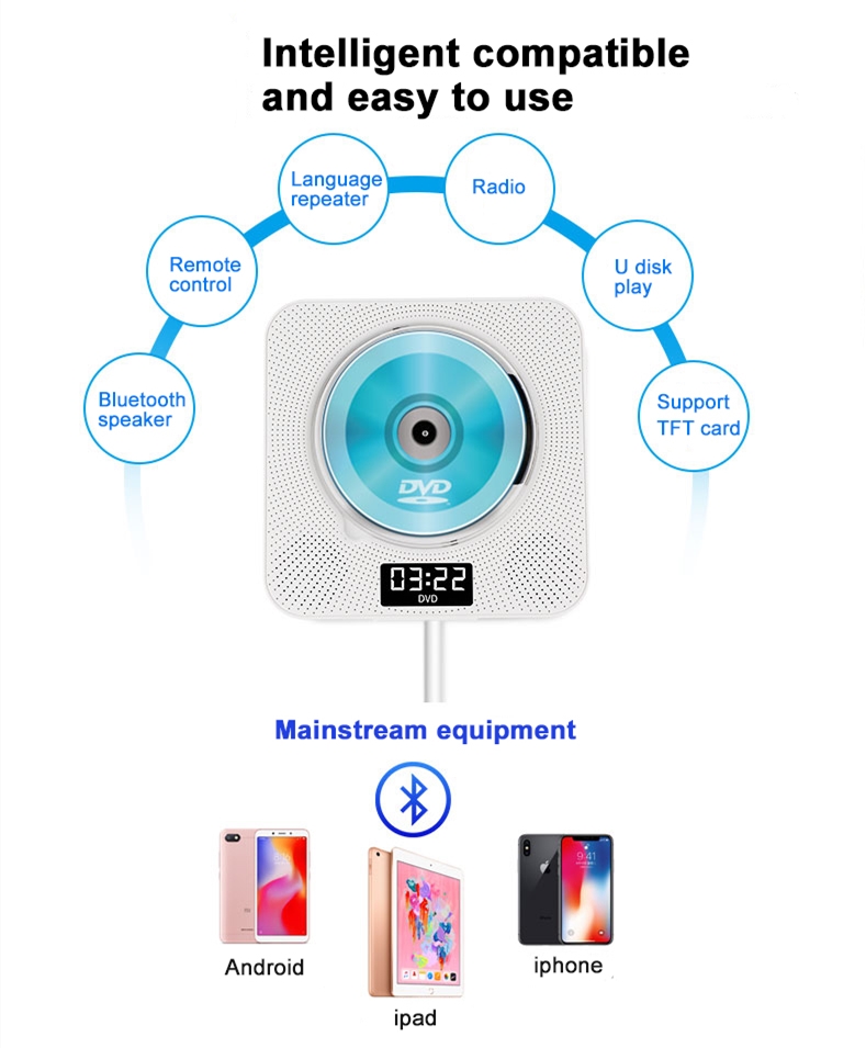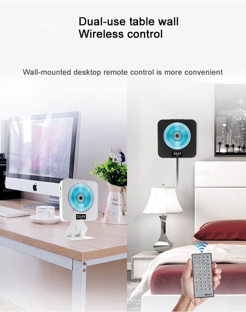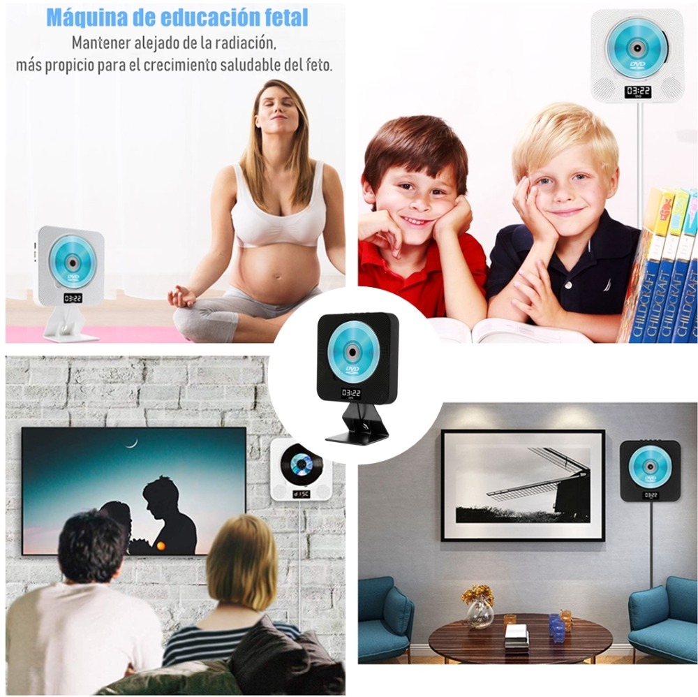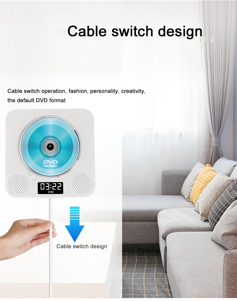 Портативный dvd-плеер: простое расширение вашей домашней развлекательной системы. Различные варианты установки: набор и настольная подставка, поставляется с настенным креплением и настольной подставкой, или где вы хотите. Светодиодный дисплей: светодиодный дисплей, показывающий различные режимы (режим воспроизведения DVD, режим воспроизведения USB, режим Bluetooth, режим fm-радио) и настройки времени. Поддерживает настройку времени воспроизведения, и вы можете засыпать мягкой музыкой.