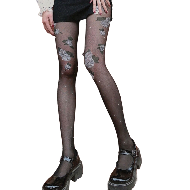 Французский стиль, винтажные жаккардовые колготки с цветными розами на бедрах, прозрачные колготки в горошек.
