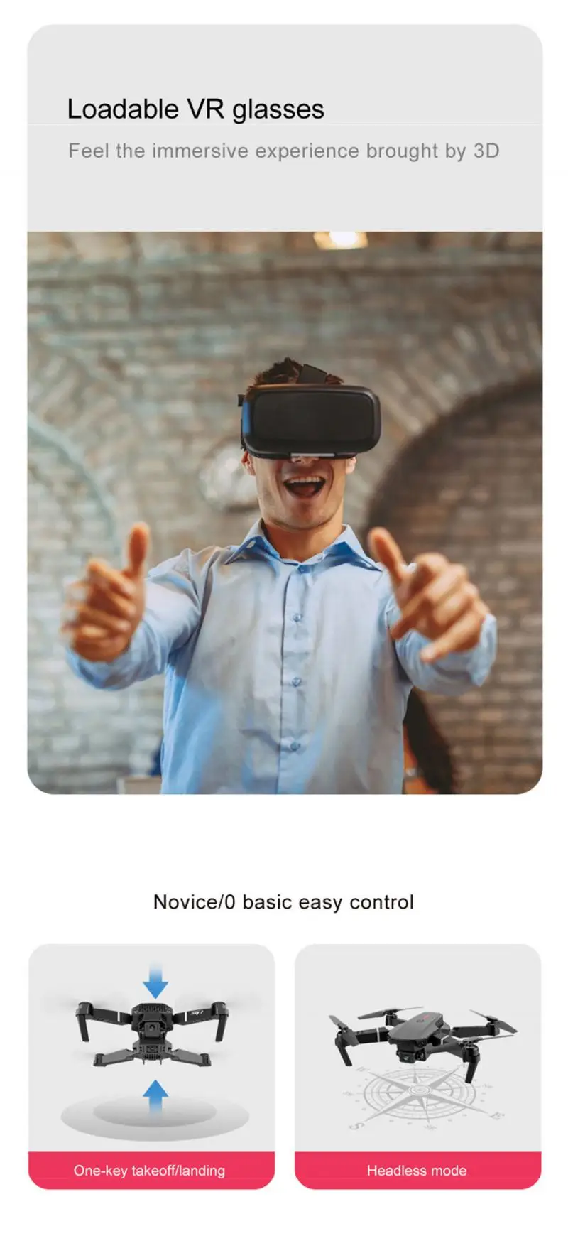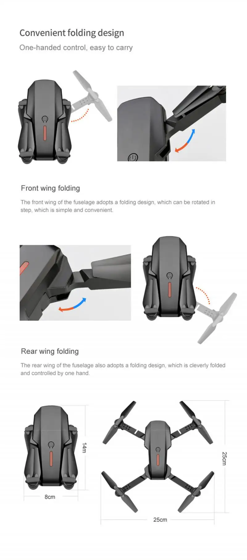 Функции: вверх/вниз, вперед/назад, влево/вправо, боковой полет, трехуровневая скорость полета, светодиодный свет, Безголовый режим, автоматическое возвращение одной кнопкой, режим удержания высоты, wiFi FPV, траектория полета, камера/видео