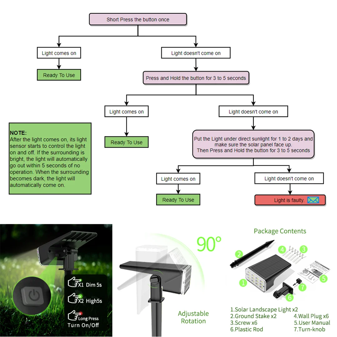 После включения этот Точечный светильник Автоматически Заряжает под солнечный светильник, автоматически включается в сумерках и автоматически выключается на рассвете.