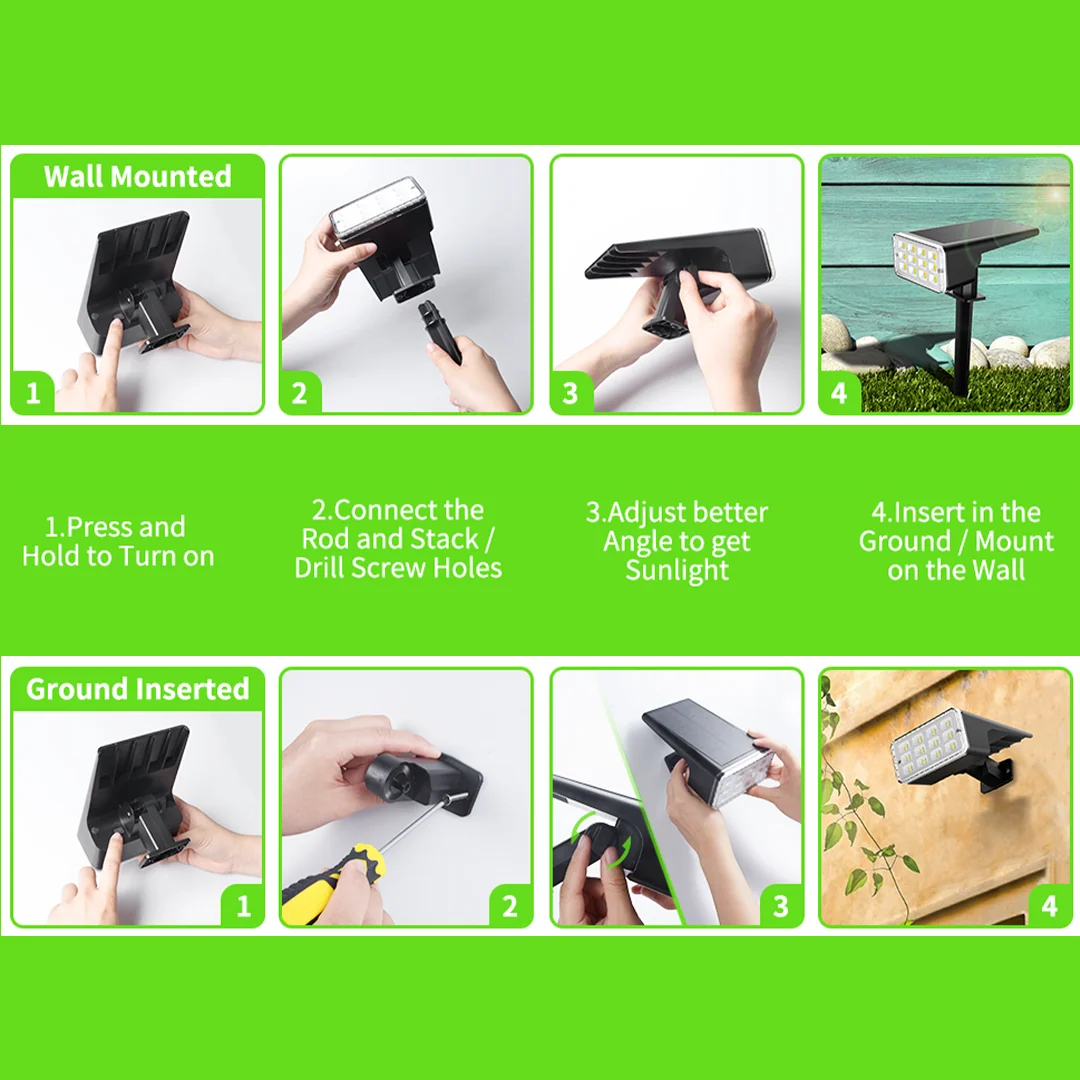 Вставьте Солнечный Точечный светильник в землю как светильник-тропинку или установите его на стену как настенный светильник. Требуются винты для заземления и винты. Этот современный Солнечный прожектор светит красивыми лучами для вашего крыльца, дорожки, двора, сада, гаража, подъездной дорожки, тропы, флагштока и т. д.