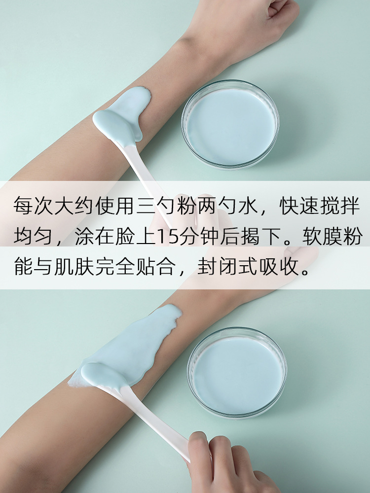 Как использовать: Возьмите соответствующее количество мягкого порошок для маски-пленки и поместите его в миску с регулировкой пленки, добавьте чистую воду и быстро перемешайте в пасту.